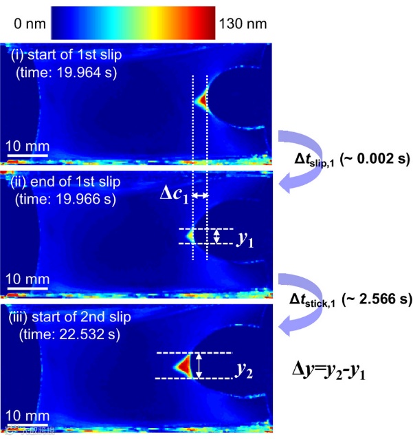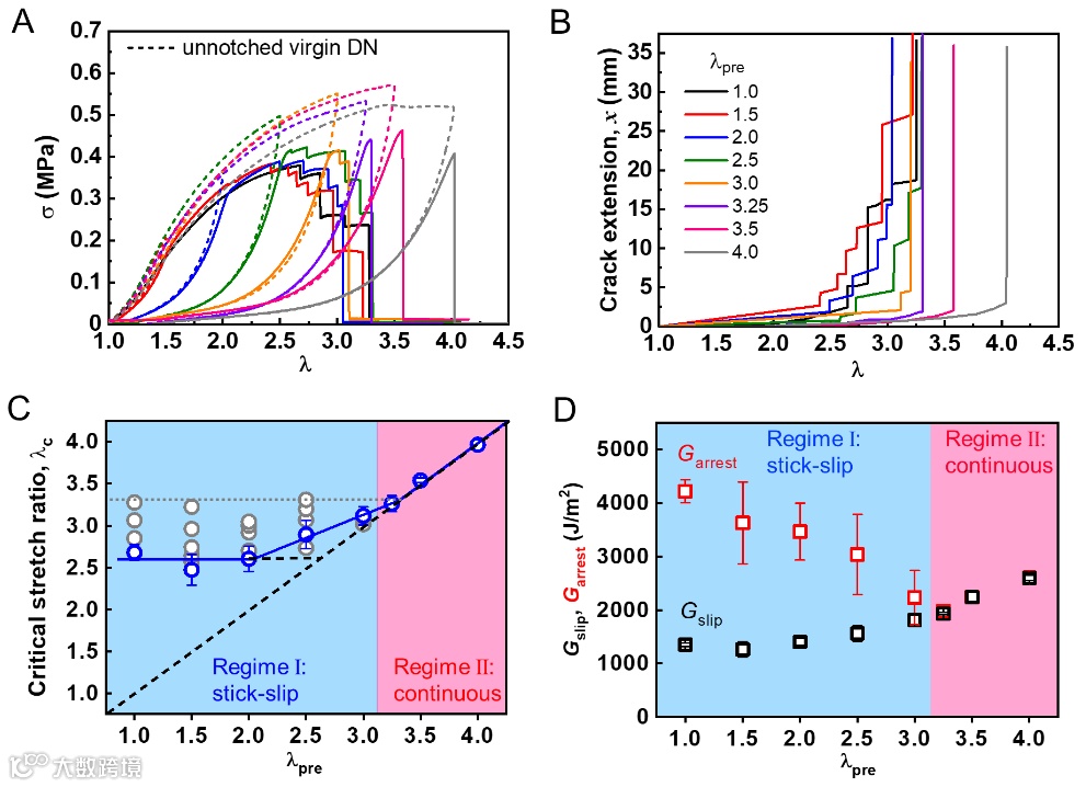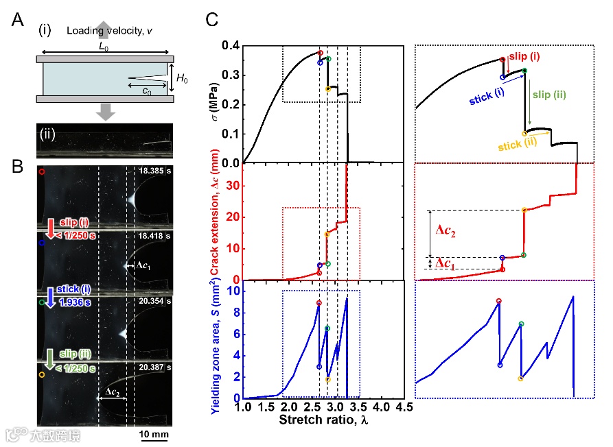 图1. 在模式-I纯剪切断裂试验中观察到双网络凝胶的滞-滑裂纹扩展动态。