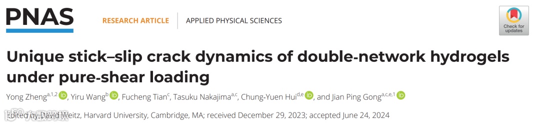 该工作近期以“Unique stick–slip crack dynamics of double-network hydrogels under pure-shear loading”为题发表在PNAS上,文章通讯作者为龚剑萍教授,第一作者为北海道大学化学反应创成研究中心博士后郑庸,目前就职于浙江大学高分子系毛峥伟教授团队担任专职研究员。文章共同作者有康奈尔大学Chung-Yuen Hui教授,北海道大学中岛祐副教授,北海道大学博士后田富成博士和北海道大学在读博士生王义茹。