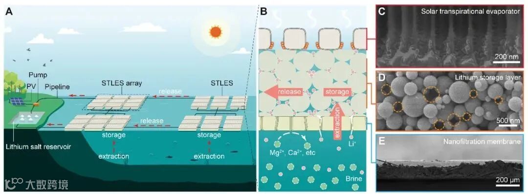 锂作为全球能源转型中的战略性关键金属,广泛应用于电动汽车电池和可再生能源储能系统。盐湖型锂矿是全球锂资源的重要来源,以我国为例,青藏高原拥有及其丰富的盐湖资源蕴藏着巨大的锂矿储量。然而,由于复杂的盐湖化学条件和极高的环境保护要求,至今难以大规模开采利用,成为我国锂矿开采的“卡脖子”难题。因此,发展绿色、环保、可持续的盐湖提锂新技术,是破解这一难题的关键,具有重要的经济社会价值和战略意义。自然界中的许多生命系统,例如盐生植物,具备高效提取特定物质的能力。盐生植物能够利用蒸腾作用,从盐碱环境中选择性吸收盐分和水分,并通过特定器官储存和排出体内多余的盐分。这种“选择性吸收-储存-释放”机制,使盐生植物能够在极端盐碱环境中维持正常的新陈代谢和生长,也为开发高效、可持续的盐湖锂资源提取技术提供了重要的仿生学启示。受此启发,南京大学研究团队成功开发了界面光热盐湖提锂装置(STLES)。其结构和工作原理如图1所示,主要包括三部分:(1)界面光热蒸腾作用在蒸发器纳米通道(图1C)内产生超高毛细压强;(2)该毛细压强传递至离子分离层(图1E),驱动锂离子选择性从盐水进入储存层;(3)通过水循环系统收集储存层(图1D)中富集的锂盐,并实现装置再生。