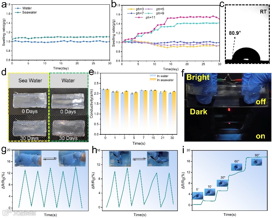 PSZC致密的网络结构还赋予了其优异的抗溶胀能力。这使得该水凝胶可以在水下长期使用而不受溶胀影响(在水中30天的溶胀率为1.7%)。将PSZC水凝胶贴附于模型鱼上,可以实时监测模型鱼的前进方向和运动速率。这些实验结果显示了 PSZC 水凝胶在水下传感中的广阔前景,使其适用于监测各种生物和水下设备的运动轨迹(图5)。