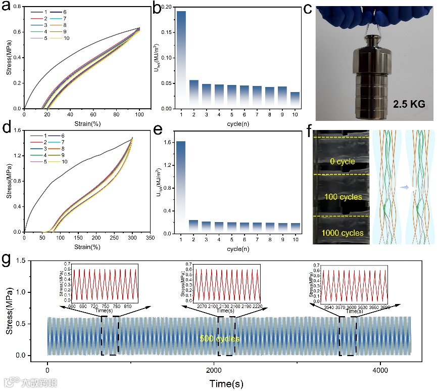 水凝胶优异的取向结构使得其有助于在拉伸方向上实现快速的应力传递,这使得水凝胶无论是在小应变(100%)还是大应变下(300%)都具有较低的能量耗散和快速回复能力。此外,各向异性的网络结构赋予了水凝胶抵御裂纹扩展的能力,在重复拉伸1000次后裂纹仍旧没有明显扩展,表明水凝胶具有卓越的稳定性和可靠性(图3)。