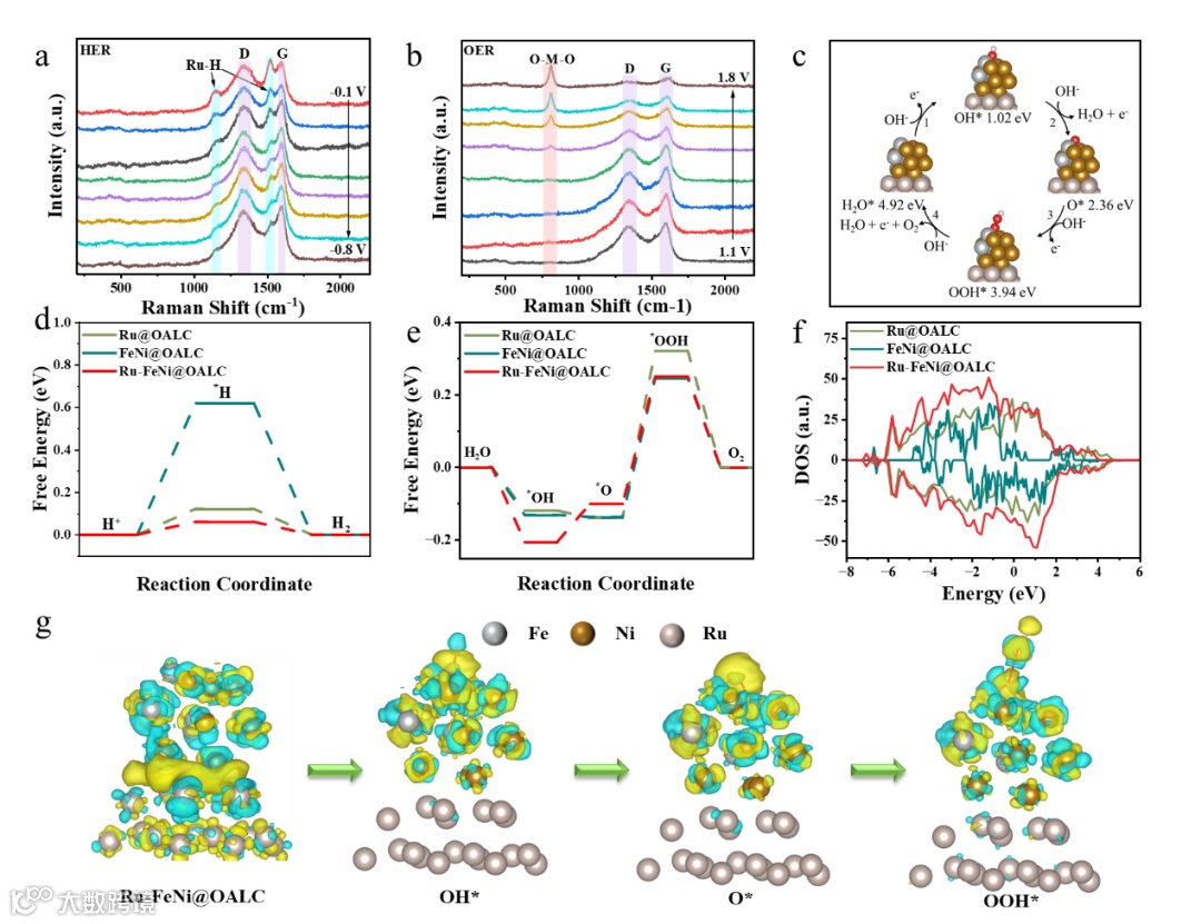 原位拉曼和DFT计算表明(图6), Ru与FeNi合金形成的异质界面能够降低反应的过电位,进一步提高OER的电催化活性。Ru-FeNi@OALC的DOS在费米能级以上比Ru@OALC和FeNi@OALC有更多的轨道重叠,增强了催化剂与表面之间的轨道杂化形成更多的反键轨道,降低HER和OER反应能垒。电荷密度差表明,Ru-FeNi异质结构显著诱导电荷密度重新分布。大量电子聚集在Ru和FeNi层之间的异质界面上,导致相对于独立的Ru和FeNi,在费米能级附近有更高的电子态。这表明Ru-FeNi异质结构的电子导电性增强,有利于加速电催化过程中的电子转移。