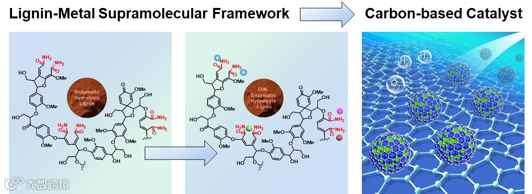 木质素通过部分开环氧化氨解改性,引入适量酰胺基作为配位基团,与金属离子(Fe3+、Ni2+和Ru3+)自组装配位形成木质素-金属超分子框架,作为前驱体热解分解形成具有高分散性的碳包覆Ru-FeNi催化剂。