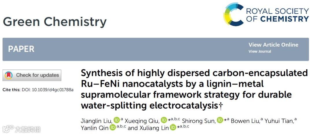 该工作以“Synthesis of highly dispersed carbon-encapsulated Ru-FeNi nanocatalyst by lignin-metal supramolecular framework strategy for durable water-splitting electrocatalysis”为题发表于Green Chemistry。广东工业大学博士研究生刘江淋为第一作者,广东工业大学邱学青教授、林绪亮教授、孙世荣博士为本文的共同通讯作者。秦延林教授等对该工作催化机理和计算部分做了重要贡献。