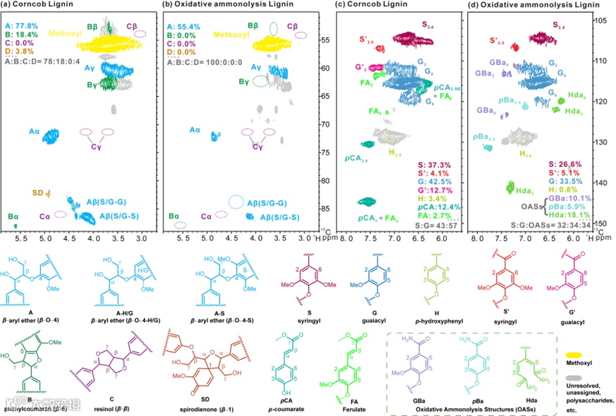 图2. 氧化氨解改性前后玉米芯木质素(DMSO-d6)的部分二维HSQC NMR谱。
