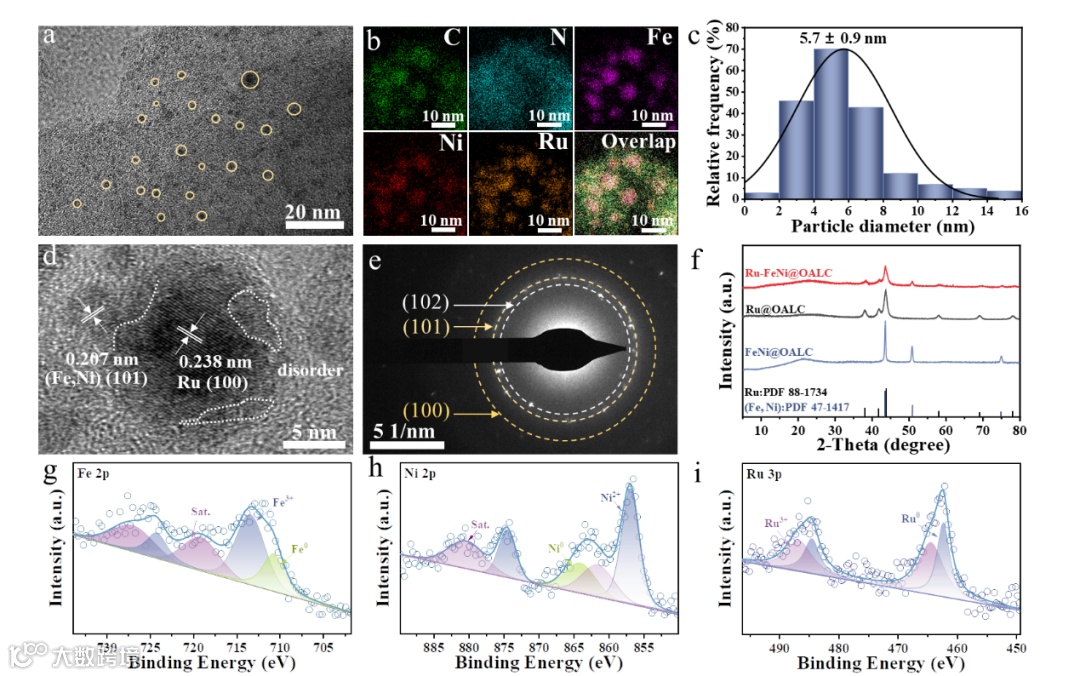 图4a高倍率TEM图像显示了在整个纳米片表面均匀分布的大小相似的纳米颗粒,导致高表面粗糙度,有利于暴露更多的活性位点,并通过消除气泡提高反应动力学。统计分析(图4c)显示,纳米颗粒尺寸范围为1 ~ 15 nm,平均尺寸为5.7 nm。木质素碳层有效地阻止了镶嵌结构形成过程中纳米颗粒的团聚,从而增加了材料的表面积和催化活性位点。在Ru-FeNi@OALC上观察到大量高分散的FeNi合金和Ru纳米颗粒。在炭化过程中,微小的FeNi合金和Ru簇在木质素衍生的碳纳米片上外延生长,形成强耦合的异质界面。XRD和XPS也同样验证了Ru簇以及FeNi合金的存在。
