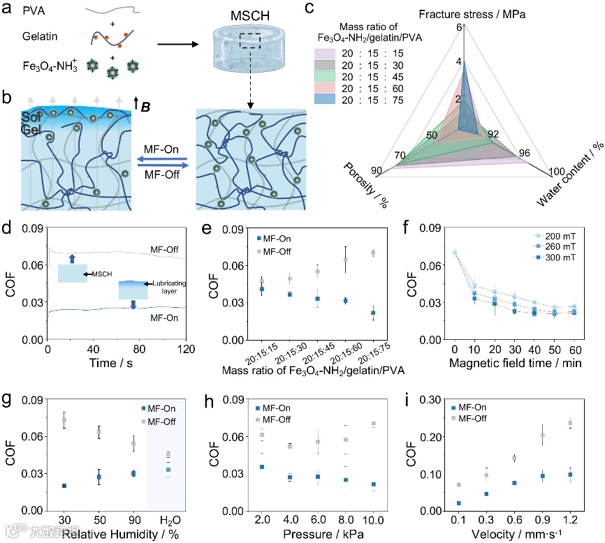 通过将磁性超分子网络嵌入到共价交联的聚乙烯醇(PVA)网络中,研究者成功合成了一种新型的磁响应半转换水凝胶(MSCH)。这种独特的水凝胶结合了超分子和共价交联的双重网络结构,使其在外加磁场下表现出独特的润滑和转换特性。当施加磁场时,MSCH中的磁性超分子网络(明胶链和Fe3O4-NH2)会发生解组装,这种解组装过程会导致凝胶表面出现一个由溶胶组成的润滑层。溶胶层主要由未被PVA网络固定的明胶链和Fe3O4-NH2纳米颗粒组成。与此同时,PVA共价网络在磁场下仍然保持完整,起到机械支撑的作用,保持整个水凝胶结构的完整。