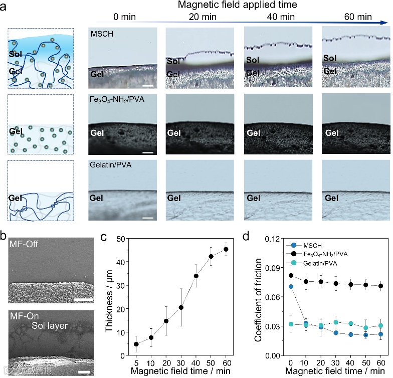 通过对不同类型的水凝胶表面的观察和比较,研究者发现,在磁场作用下,只有MSCH水凝胶的表面会产生一层液层。这层液体的形成是MSCH水凝胶展现出良好润滑性能的关键因素。SEM观察显示,在MF-On的水凝胶表面上有一个不规则的纤维层,这层纤维结构可能是磁性超分子网络解组装导致(明胶和Fe3O4-NH2)。随着暴露时间的增加,溶胶层的厚度也在逐渐增加,并且摩擦系数也会随之下降。
