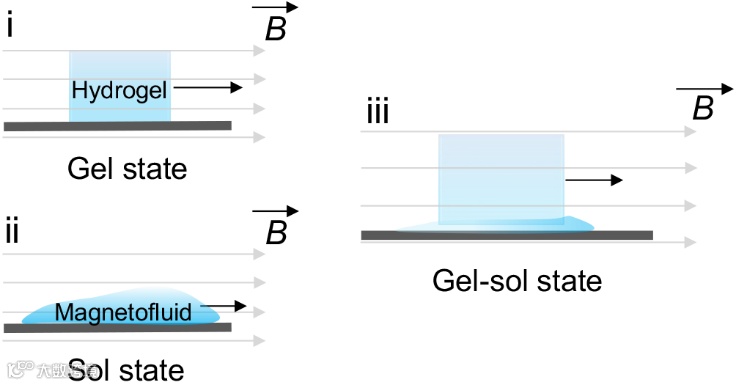 研究者通过将带正电荷的Fe3O4-NH2纳米粒子与带有负电荷的明胶链利用静电相互作用结合在一起,成功制备了一种具有磁响应特性的超分子-共价半转换水凝胶。在水凝胶中,明胶自组装形成了三螺旋结构,而Fe3O4-NH2纳米粒子通过静电吸附到明胶的分子链上。当施加磁场时,水凝胶表面会受到显著的机械力作用。这种机械力能够破坏水凝胶网络中相对较弱的非共价键,使得水凝胶在外界刺激下表现出独特的凝胶-溶胶转变行为。差示扫描量热法(DSC)结果显示,磁场的作用类似于温度的升高,会降低明胶三螺旋结构的稳定性。在磁场作用下,明胶三螺旋的解组装引发了水凝胶状态(凝胶-溶胶)的变化,这与温度诱导的解组装现象具有相似之处。