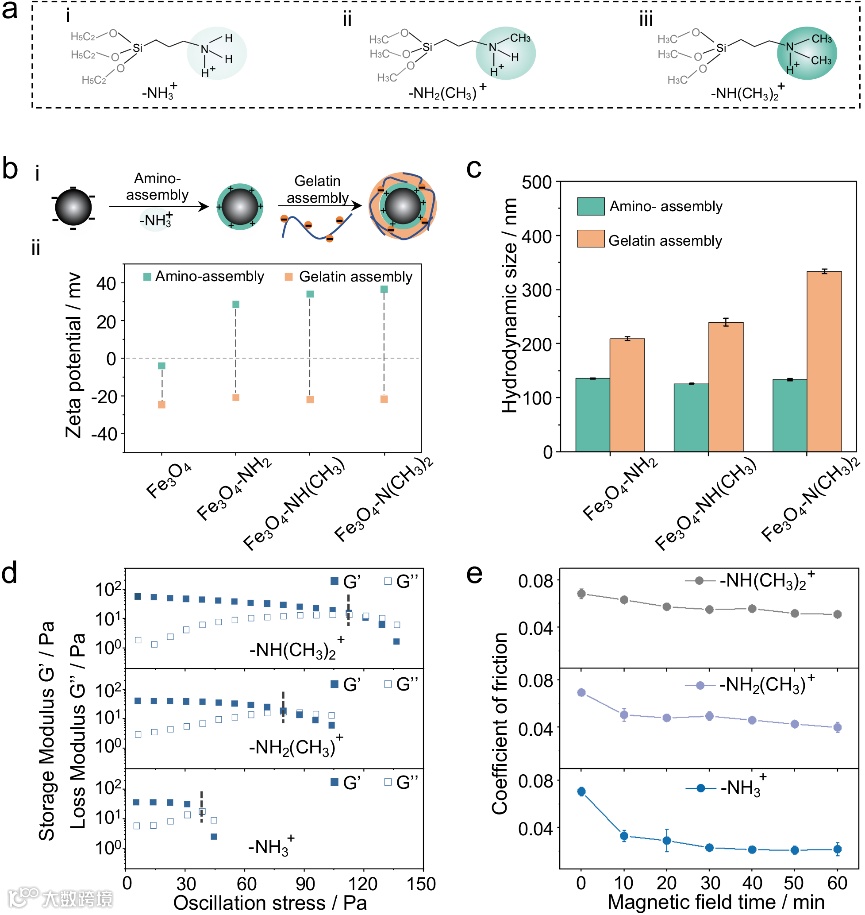 为了深入调控磁性超分子水凝胶的解组装能力,研究者通过改变磁性粒子与明胶分子链之间的相互作用,对Fe3O4纳米颗粒进行了表面修饰。具体来说,引入了三种不同的氨基末端基团(-NH2,-NH(CH3),和-N(CH3)2)到Fe3O4纳米颗粒的表面,以研究这些修饰对水凝胶性能的影响。通过表面电位和水合粒径的分析,发现带有-N(CH3)2末端基团的粒子表现出更强的正电位。这种增强的正电位使得它们能够更牢固地与明胶分子链上的负电荷结合。这种强结合力不仅赋予了超分子水凝胶更高的力学性能,而且还影响了其在磁场作用下的解组装行为。使得这些粒子与明胶分子链之间的静电相互作用更为显著,增强了水凝胶的结构稳定性。因此,在磁场作用下,这种修饰的水凝胶表现出较弱的解组装行为,表现为摩擦系数随磁场作用时间增加而降低的幅度较小。