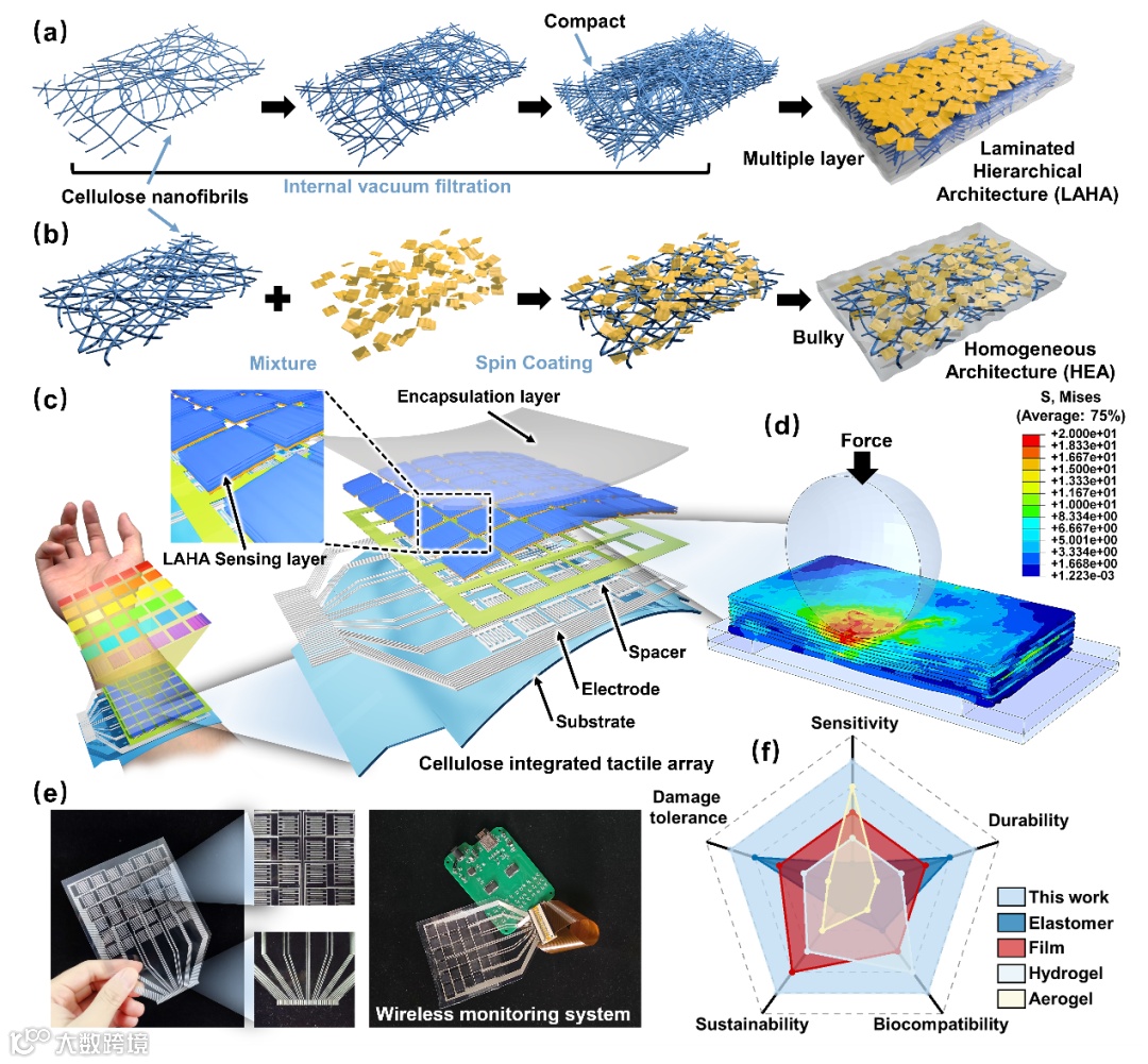 大量的研究工作发现,一种典型的结构加固策略与天然贝壳的非均质性微观结构有关,天然结构中较强的垂直阻尼具有较好的能量耗散效果,可以抑制明显的应力扩散和垂直冲击。北京林业大学杨俊和山东理工大学郝三伟等人在前期研究的基础上(Nat. common. 2022, 13,6472),提出了一种生态友好的多通路全纤维素集成触觉阵列,依赖于层压堆叠的传感层结构(LAHA)来缓解长期触觉评估中的循环寿命低的问题。通过与均质结构功能层的交叉验证,LAHA利用致密的层压结构,极大地促进了垂直受压状态下的面内应力分布,提供了持久可靠的感官增强(150,000次循环)。进一步以该大面积触觉阵列为核心设计了无线读取系统,实现了抗干扰性可穿戴人体姿势识别和多设备触觉时空映射同步呈现,满足实时和大面积的皮肤触觉反馈需求。