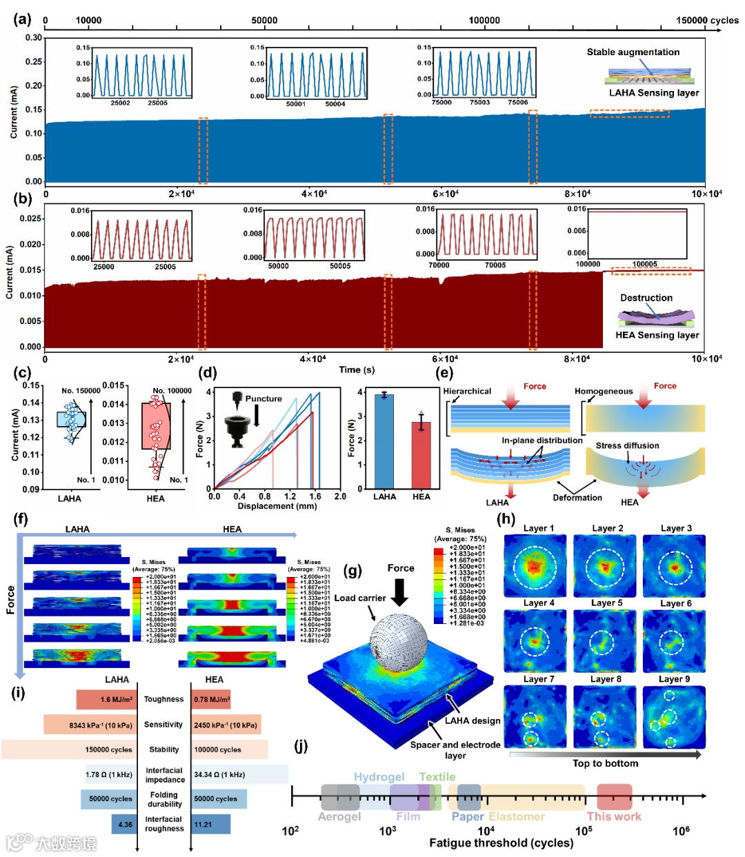 循环响应耐久性是稳定感官增强最直观的证据。文中分别对LAHA和均质结构传感单元施加循环压力,LAHA传感单元能够快速稳定响应循环次数高达150,000次,与均质结构传感器较短的寿命周期和明显的信号波动(≈28.6%)形成鲜明对比。LAHA结构设计优势在全循环测试期间的信号离散分布程度差异中有明显体现,而且在穿刺实验中LAHA结构具有更高的耐力学损伤表现。利用有限元模拟可以分析出LAHA设计中具有叠层取向的片层和有效的界面耦合共同起到了很强的阻尼作用,阻碍了垂直应力弥散。其主要过程为伴随着外力加载,广泛的面内应力扩散发生在相邻层的扩大接触区域,当接触单元最大主应力达到临界值时,位于无序中心部位的弯曲和屈曲主导了逐层结构变形。