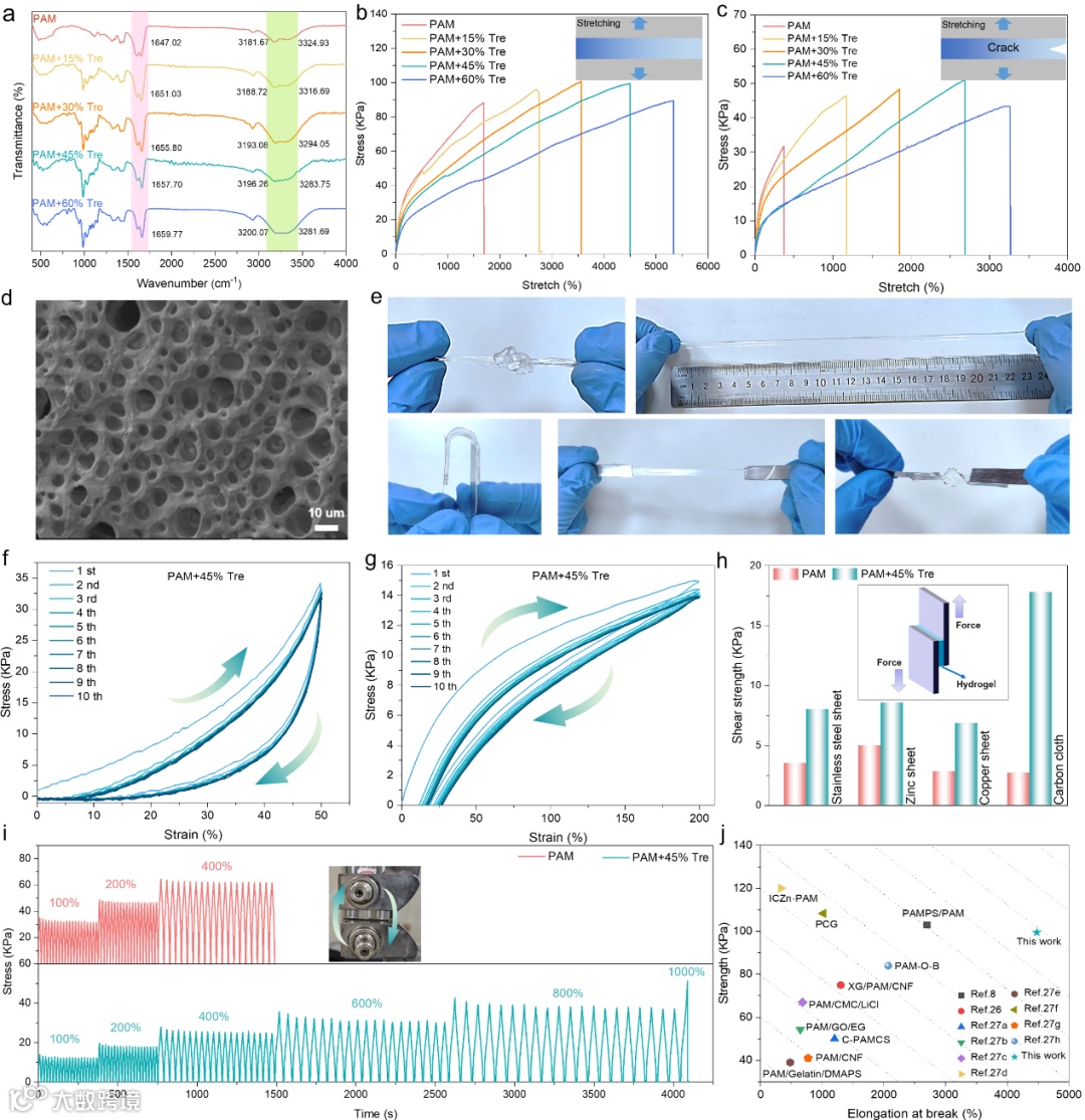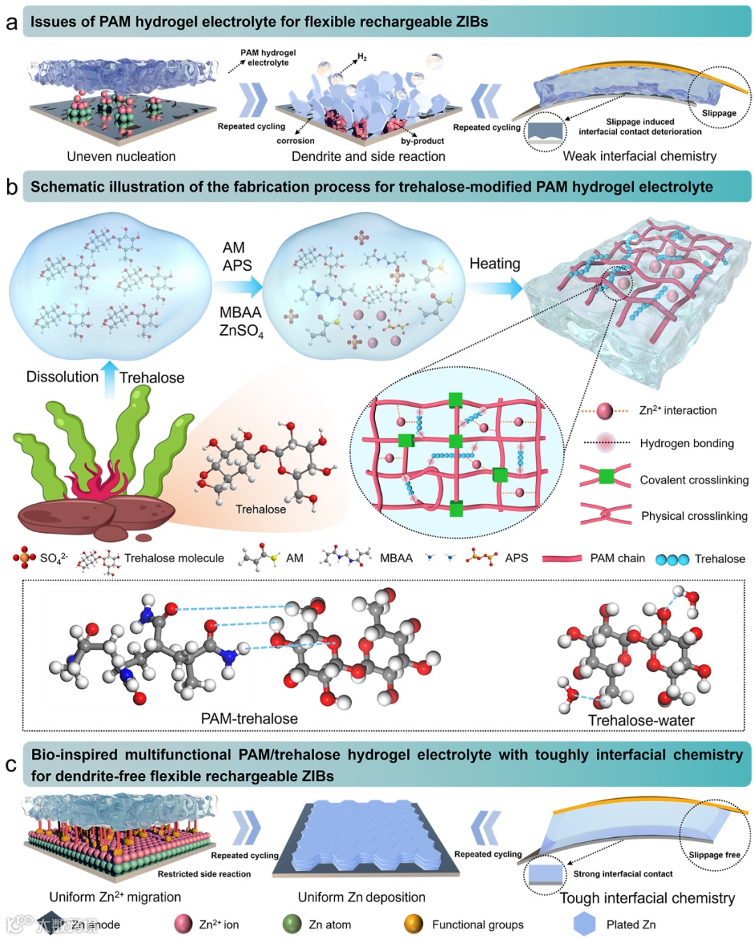 针对以上问题,贵州大学黄俊特聘教授、谢海波教授和南昌大学陈义旺教授报道了一种具有强界面化学的仿生多功能水凝胶网络(PAM/trehalose),该水凝胶电解质通过网络修复策略,具有优异的机械性能和粘附性能,实现了无枝晶和长寿命的柔性ZIBs。结果表明,海藻糖改性的PAM水凝胶具有优异的力学强度和断裂伸长率,分别可达100 kPa和5338%,并且对各种基材具有很强的粘附性。此外,PAM/trehalose水凝胶电解质为锌阳极提供了优异的抗腐蚀能力,并调节了锌的成核/生长,从而实现了高达98.8%的库仑效率和超过2400 h的长循环稳定性。重要的是,柔性Zn//MnO2电池在不同弯曲条件下表现出优异的容量保持率,这在柔性能源相关应用及其他领域具有很大的潜力。