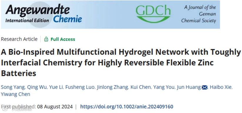 该研究成果以“A Bio-Inspired Multifunctional Hydrogel Network with Toughly Interfacial Chemistry for Dendrite-Free Flexible Zinc Ion Battery”为题在线发表于国际顶级期刊《Angewandte Chemie International Edition》上,DOI: 10.1002/anie. 202409160。论文第一作者为贵州大学硕士研究生杨宋,通讯作者为贵州大学黄俊特聘教授、谢海波教授和南昌大学陈义旺教授。该研究工作得到了国家自然科学基金,贵州省成果转化重点项目,贵州省基础研发计划等项目的资助。