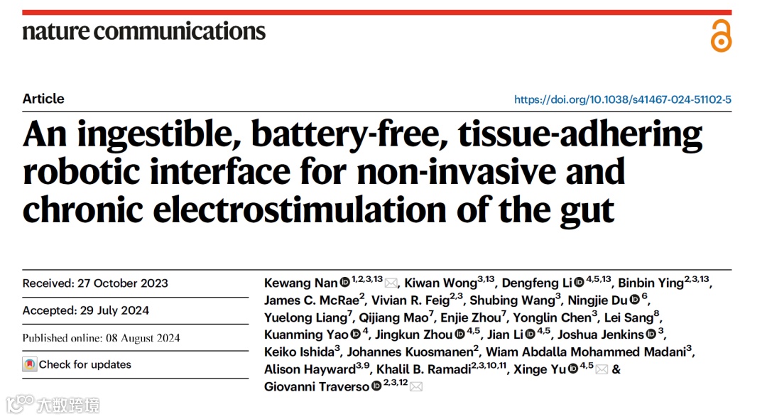 近日,浙江大学南科望研究员、香港城市大学于欣格教授和麻省理工学院Giovanni Traverso教授三校联合,另辟蹊径地寻求运用非药物、无创、可远程操控的方法来调节活体内的胃饥饿素水平。该团队合力研发了一款可吞服、无电池、组织粘附的软体机器人(IngRI)用于非侵入性的胃部电刺激,并在成年猪体内实现了胃饥饿素水平的调节。该工作“An ingestible, battery-free, tissue-adhering robotic interface for non-invasive and chronic electrostimulation of the gut.”发表于Nature Communications,浙江大学药学院为本研究第一单位。主要作者包括黄麒运(麻省理工学院研究生)、李登峰(香港城市大学博士后)、应斌斌(麻省理工学院博士后)、茅棋江(浙医附属邵逸夫医院)、杜凝洁(浙江大学研究生)、桑磊(合肥工业大学教授)等。