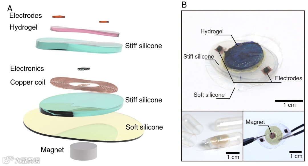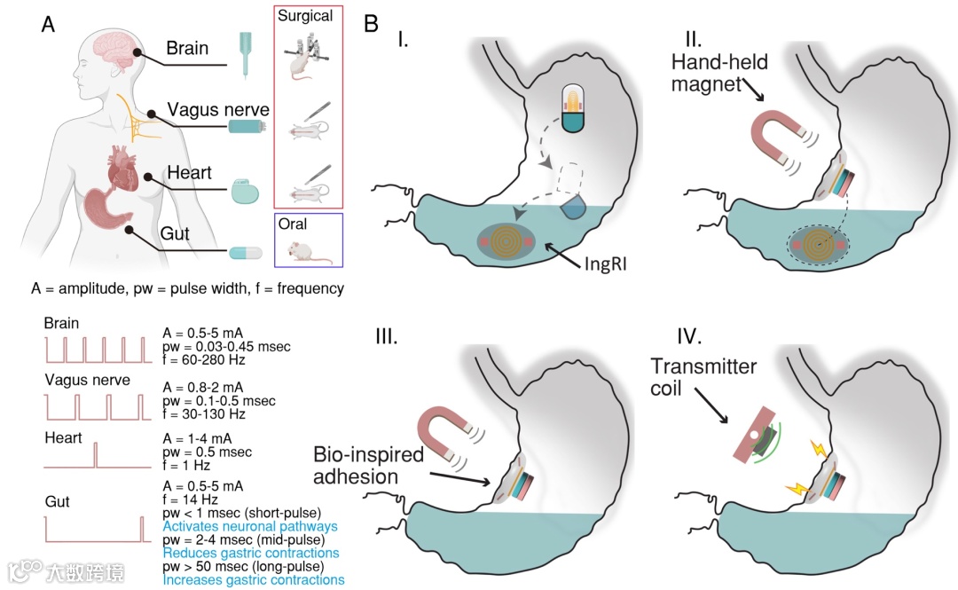论文展示了一个创新的可吞服软体机器人(IngRI,图1),它是一种设计用于在消化道内进行无线长期电刺激的设备。IngRI最初被封装在一个明胶胶囊中,当胶囊进入肠道后,它会溶解并释放出折叠的IngRI。一旦释放,IngRI可以利用外部手持磁铁的帮助,在肠道中导航至所需的位置,特别是胃部。到达目标位置后,IngRI利用仿生水凝胶的粘附作用,牢固地附着在胃粘膜上,确保设备的稳定性和适形电极与组织的有效接触。通过近场感应耦合,IngRI能够提供可编程的电脉冲,用于刺激胃肠道中具有电兴奋性的细胞,以达到治疗的目的。这种设备的设计克服了传统可摄入电刺激设备的一些限制,如电极与组织接触不良和电池寿命有限,为胃肠道疾病的治疗提供了新的可能性。