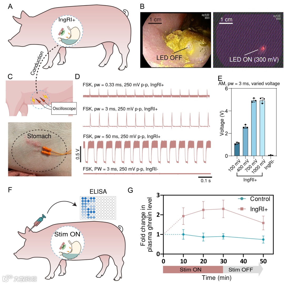 最后,研究人员使用成年猪模型进行了活体实验,通过内窥镜图像展示了IngRI在肠道内对LED设备进行无线供电的能力(图5)。这种无线供电技术证明了IngRI在真实生物环境中的实用性和可靠性。为了进一步验证IngRI的功能,团队测量了其传递的传导信号。实验中,针电极被放置在猪的腹部,检测并记录了相应的波形。结果显示,皮下针电极记录的FSK调制下的不同脉冲宽度波形清晰可见,而对照实验表明无线传输不会干扰皮下记录。此外,研究还探讨了在AM调制方案下使用不同输入电压时皮下记录的平均输出电压。实验结果表明,不同输入电压下的输出电压具有显著差异,为IngRI的实际应用提供了重要数据支持。研究团队还测量了使用IngRI刺激的成年猪血浆胃生长激素释放肽水平,并展示了血浆胃生长激素释放肽水平随时间变化的平均倍数变化。