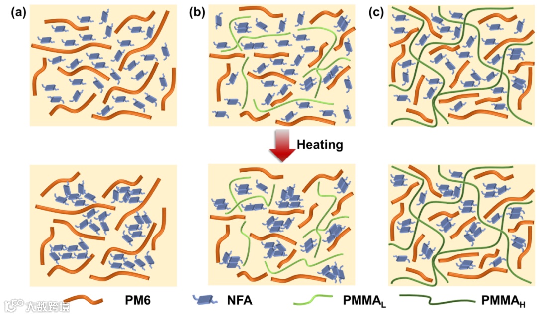 最终,作者测定了PMMA与给体和受体分子的相容性,并通过示意图(图5)展示了在热老化过程中添加不同分子量PMMA的活性层形貌变化,揭示了PMMAH显著提升器件稳定性的机理。