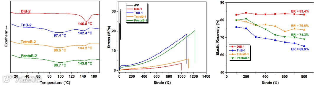 在本研究中,通过精准调整OBC的总嵌段数、各嵌段长度、1-辛烯插入率,在保持高熔点的同时,获得了力学性能可调的聚丙烯基弹性体。如图2所示,所得五嵌段OBC在强度(可达24 MPa)与韧性(伸长率可达1300%)相较二嵌段OBC显著提升的同时,弹性回复率仍可达到74%。这种兼具高熔点、高强度、高弹性回复的聚丙烯基弹性体,综合性能优于目前市售的OBC商品,引领聚烯烃材料向高性能、高值化发展的趋势,在汽车、电子、日用品、家电、鞋材、电缆及聚烯烃改性等领域显示出极具潜力的应用前景。