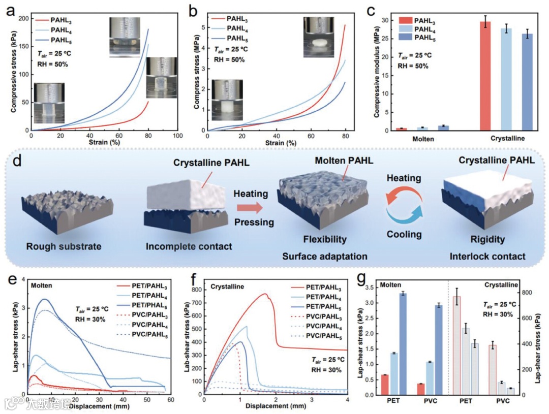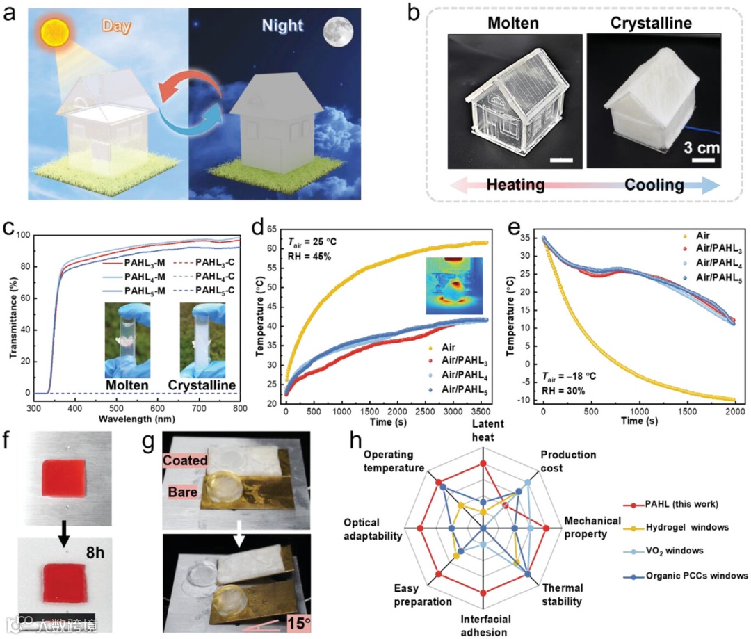 近期,该团队受耐盐动/植物在盐度环境中的吸水行为和“Hofmeister”理论的启发,通过亲水性单体在熔融盐水合物中的原位聚合,制备了高度稳定的相变凝胶(PCSG)(图1),发展了chaotropic 离子类型水合盐相变材料的普适性形状稳定性策略。通过密度泛函理论、拉曼光谱和红外光谱分析揭示了离子、水和聚合物链之间的相互作用(图2)。所制备的PCSG具有适宜的Tm(≈20-26 oC)和高潜热(≈216.5 J g-1)(图3),可将40 oC的加热物体快速冷却至35 oC(t ≤ 100 s),适用于高效安全的人体温度管理(图5)。伴随着盐水合物的熔化/结晶相变,PCSG可在柔性(可变形)和刚性状态之间自由切换,并实现附着力增强(图4)。在熔融态和晶态之间还具有光学透明度切换,因此还可以实现具有合适昼夜温差环境下的节能阳光房的温度管理(图6),在白天,PCSG通过吸热熔化来缓解升温,同时不会阻碍光线通过;夜间,结晶引起的热量释放实现了保温,凝胶发生不透明转变可保护用户隐私。在-18 oC的极寒地区,PCSGs还具有抗冻和阻冰性能。鉴于该方法的通用性、可用盐水合物和单体的丰富来源与低成本、以及优异的热性能和机械性能,该研究为进一步系统探索相变凝胶在热管理、智能窗户和阻冰涂层中的应用提供一条有趣的途径。