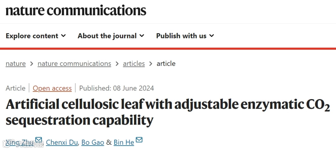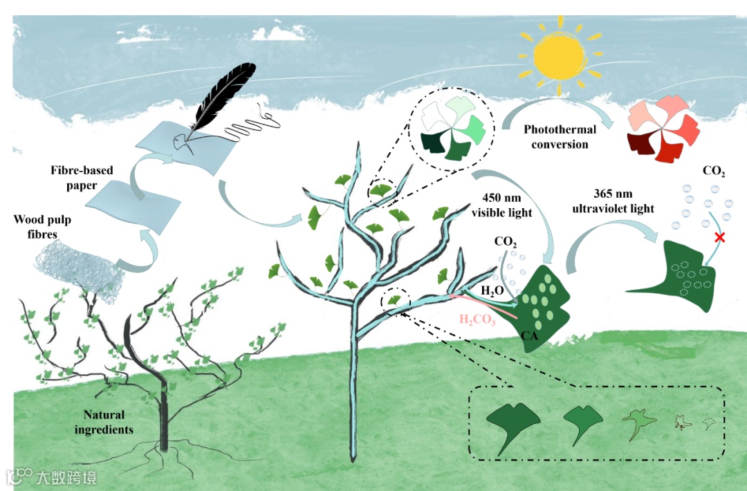 开发人工树叶处理环境超载的CO2对于碳中和意义重大。近期,陕西科技大学生物质与功能材料研究所(王学川教授团队)与纤维新材料及废弃物资源化利用团队(张素风教授团队)成员合作从绘制于纸上的画中树叶出发,制备了一种迄今为止最接近自然叶片的EcoLeaf。该叶片以可见光作为唯一驱动源,在“气孔”可控开合与“叶柄”物质交换的联用下实现叶片对空气中CO2固碳速率的调节。此外,该Ecoleaf具有与自然叶片相似的纤维素组分,可顺利地参与生态系统降解与养分循环过程,且Ecoleaf中的固碳途径具有可设计性,未来可为其它生物固碳途径提供仿生的多功能平台。该工作以“Artificial cellulosic leaf with adjustable enzymatic CO2 sequestration capability”为题发表在《Nature Communications》上(Nat Commun, 2024, 15(1): 4898)。