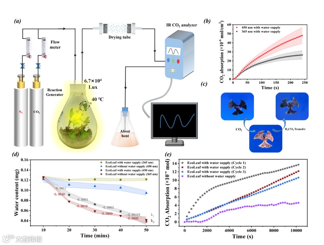 中国古代神话故事中一位名叫马良的画家可以借助神笔使所画之物走进现实。受该启发,本研究以纸张上绘制的树叶出发构建了如图所示的仿生功能化叶片。基于对叶片染色深度与光照强度的控制,该叶片可将可见光能转化为可控的热能以维持CA碳捕获的最佳活性。在365 nm和450 nm光源的循环激发下,EcoLeaf基质的“气孔”尺寸会发生循环的收缩与扩张,从而实现叶片在恶劣环境下的自我保护与在适宜环境下高效捕碳的可控切换。将叶片的叶柄与水源相接可为叶片捕获气态CO2提供充足的质子来源并避免固碳产物的积聚。土壤降解实验结果表明EcoLeaf在40天内能够被自然土壤完全降解,且降解产物不会对土壤微环境造成影响,实现化作春泥更护花的美好理想。
