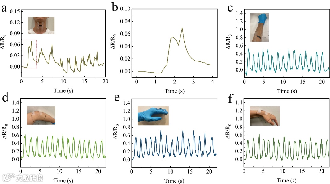 MXene热电织物作为应变传感器,具有良好的灵敏度和监测范围。通过自身的形变,MXene热电织物可以准确识别喉关节、肘关节、腕关节运动,以及手臂肌肉颤抖,展示良好的运动监测能力,在人体运动监测中具有潜在的应用前景。