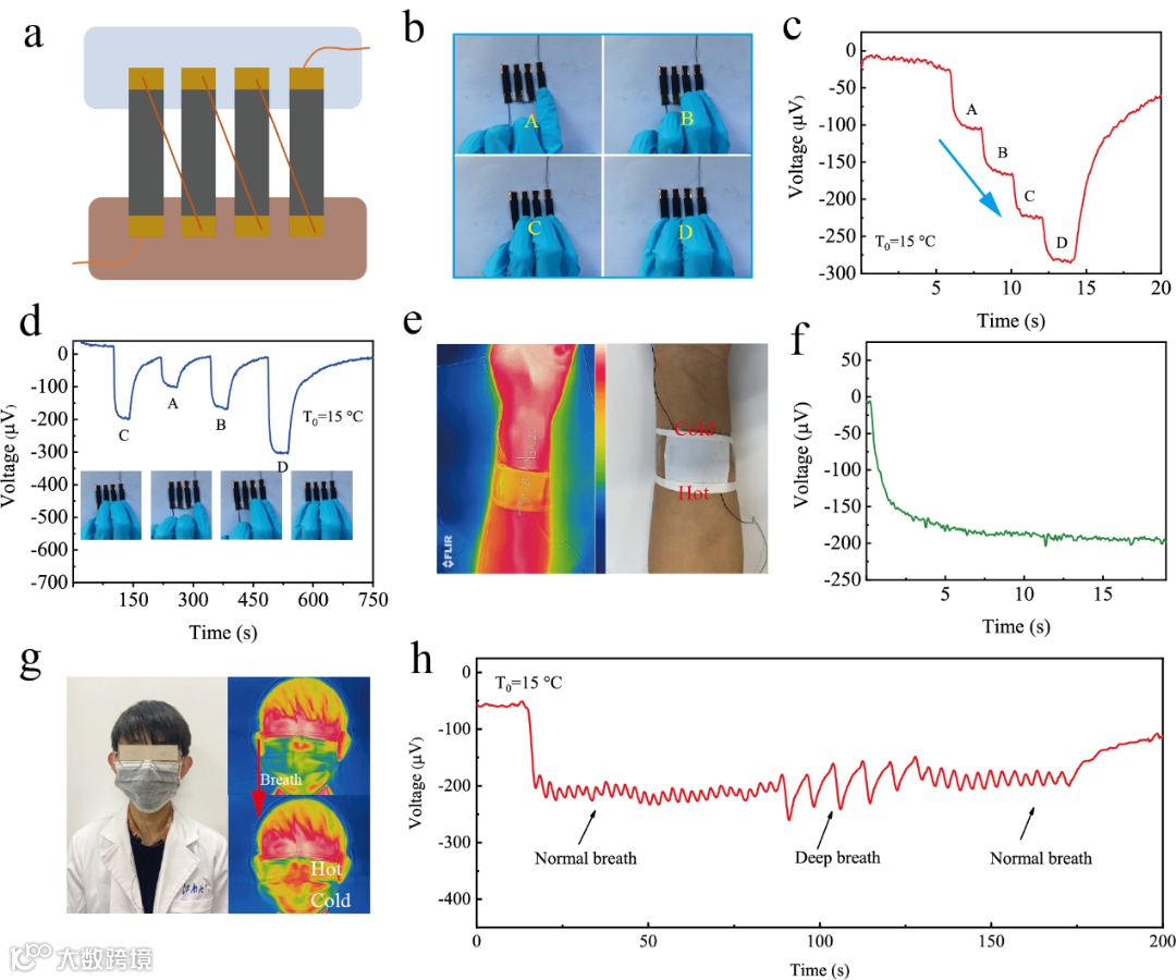 在热电应用方面,MXene热电织物能够利用外界温差实现能量收集,且具有优异的温度传感能力。通过将MXene热电织物设计成热电传感阵列,不仅可以提高电能的收集,还可以作为触觉识别系统,感知外界刺激的变化。此外,我们将热电传感阵列连接到口罩上,一端靠近呼吸区,另一端远离呼吸区(图4g),使热电传感阵列两端温度的存在差异,从而使输出电压随呼吸模式的变化而改变,且准确识别身体的呼吸状态,证明了该热电阵列具有监测呼吸状态的能力(图4h)。