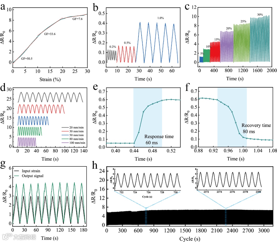 MXene热电织物不仅呈现良好的热电性能,作为应变传感织物,其也具有优异的应变传感性能。如图3所示,观察到MXene热电织物作为应变传感器,最高灵敏度GF达到50.5,低检测极限达到0.2%,以及30%的宽监测范围,对于外界刺激具有快速的响应和恢复时间(60/80ms),超过了文献中大多数报道的值,且在3200次拉伸释放循环过程中呈现良好的应变传感稳定性。