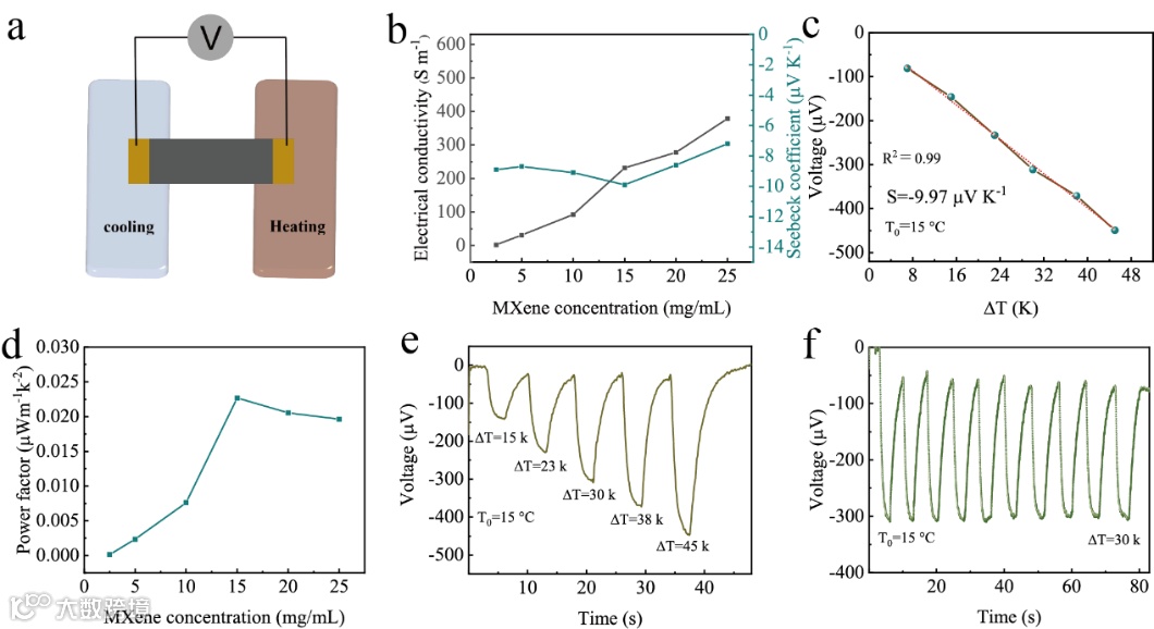 当MXene热电织物的两端分别与冷源(未加热)和热源(加热)接触时,两端的温差诱导电子从热端流向冷端,迫使电子在MXene热电织物冷端不断积累,从而导致MXene热电织物两端的电压差不断增加。热电性能表征结果显示MXene热电织物的最高塞贝克系数达到-9.97 μVK-1,且具有良好的热电循环稳定性(图2)。