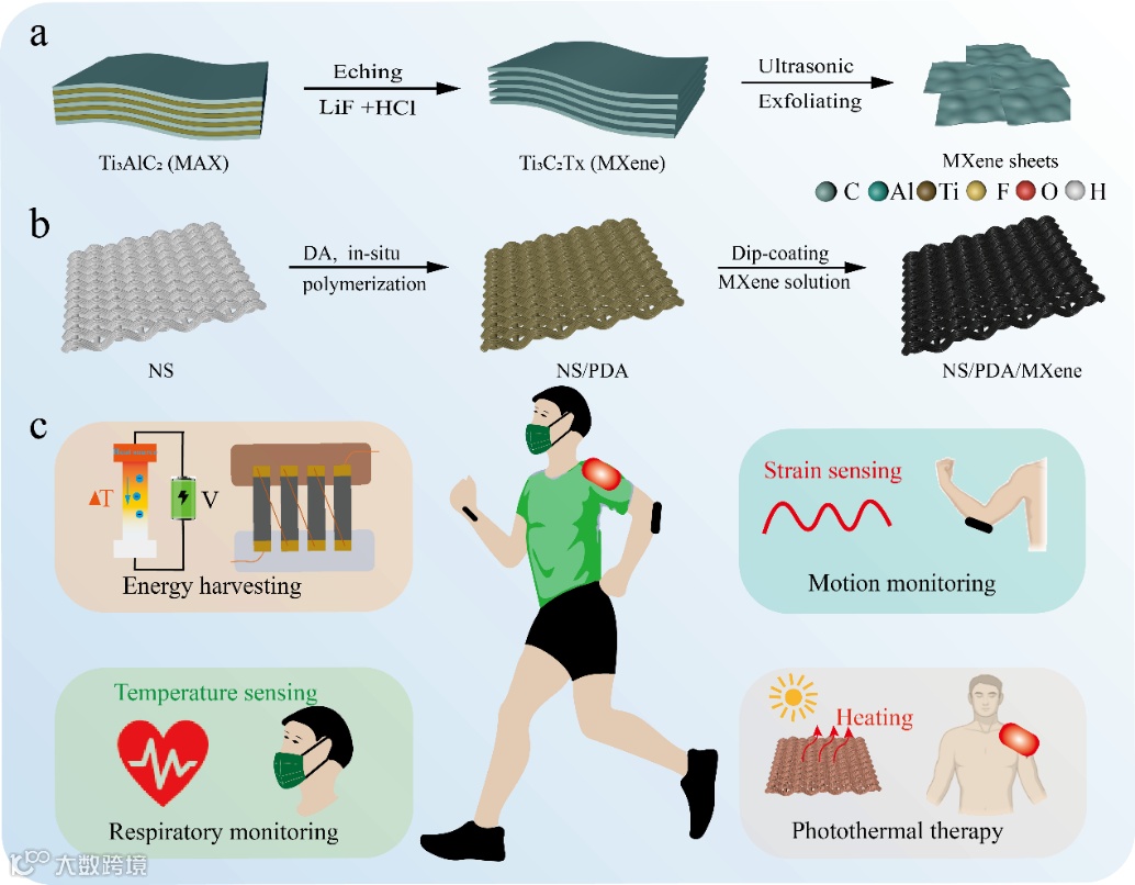 针对以上问题,江南大学王潮霞教授和加拿大滑铁卢大学Yuning Li 教授提出了一种具有多功能传感能力和自供电潜力的MXene热电织物。这种以织物为基材的可穿戴热电器件,利用织物基材自身的柔韧性和透气性,成功解决了人体穿着舒适性问题。而基于MXene材料设计的热电织物在温度传感和应变传感方面都表现出色,是连续数据收集和监控的理想选择。这种将MXene材料和与纺织技术相结合的能力,推动可穿戴智能织物的发展,使智能织物离实用更进一步,展示了在能量收集、运动跟踪和健康监测方面具有广阔的应用前景。