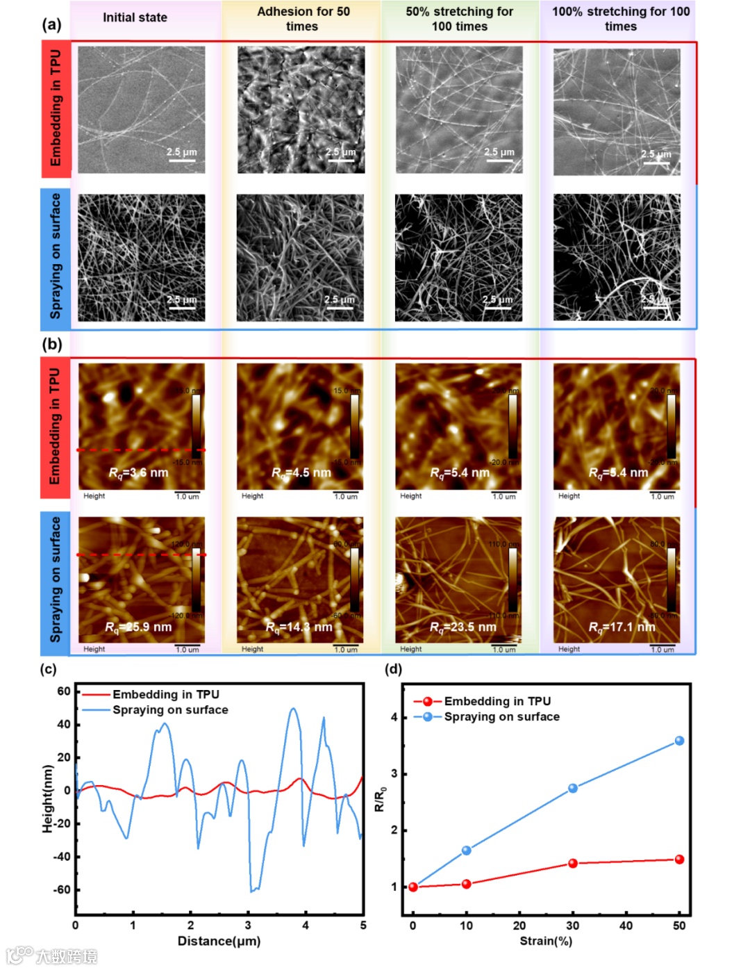 尽管已经有许多研究工作聚焦于可拉伸电极,但是囿于可拉伸电极力学性能与电学性能两者间的协同与平衡,在力学与电学性能方面都存在瓶颈。因此,研究团队首先利用喷涂策略构筑均匀的图案化AgNWs薄膜,接着将TPU溶液浇筑在AgNWs薄膜表面,热退火后剥离得到Strem-AT可拉伸复合电极。通过引入表面喷涂结构的电极作为对比,证实了Strem-AT可拉伸复合电极具有更光滑的表面形貌、良好的透光性以及优异的电学性能,即使拉伸应变达到 100%,Strem-AT可拉伸复合电极的电阻仍保持相对恒定(图2)。