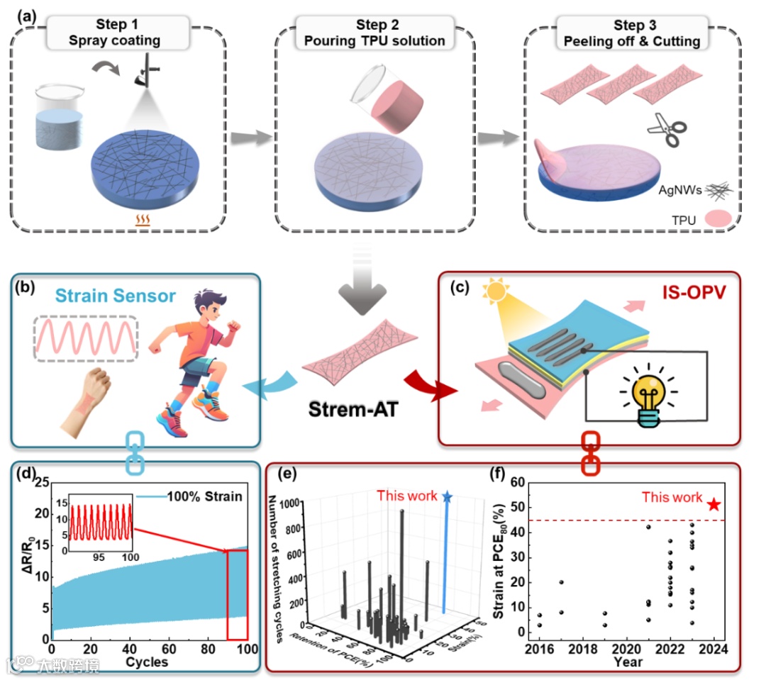 针对这一挑战,天津大学材料学院叶龙教授课题组制备了一种可拉伸银纳米线/热塑性弹性体复合电极(以下简称 Strem-AT)。该电极利用高分子热塑性弹性体的粘弹性和出色的力学性能,获得了光滑的表面以及优异的延展性和电学性能,并被成功应用于可拉伸传感器和本征可拉伸有机光伏电池(IS-OPVs)中。构建的可拉伸传感器能够准确、及时地传感手腕、肘部和手指各种关节应变,其循环耐久性也得到了验证。更重要的是,以Strem-AT电极为底电极构建的IS-OPVs实现了12.6%的能量转换效率(PCE),其PCE80% 应变高达 51%,并且在50%拉伸应变下循环拉伸1000次后,IS-OPV的效率能达到初始效率的76%(图1)。