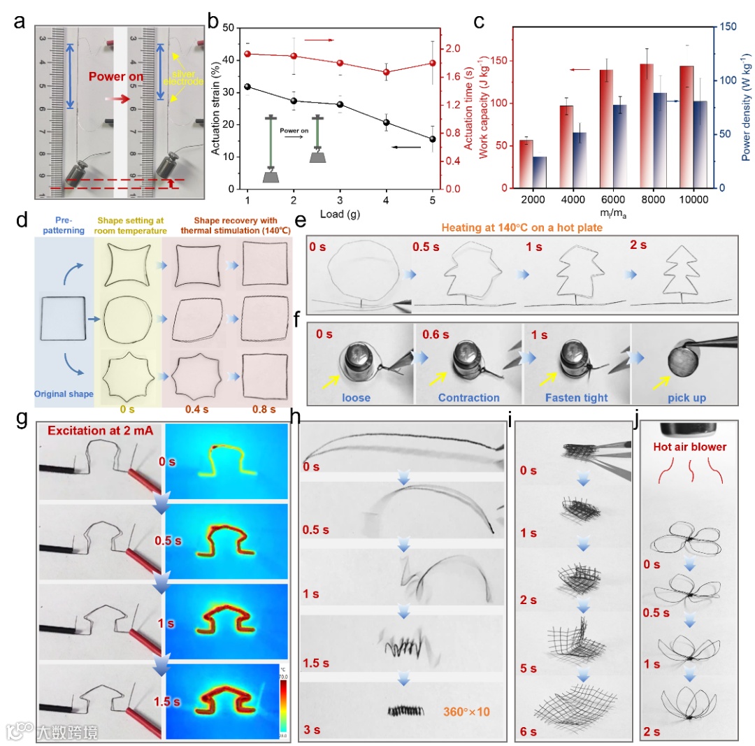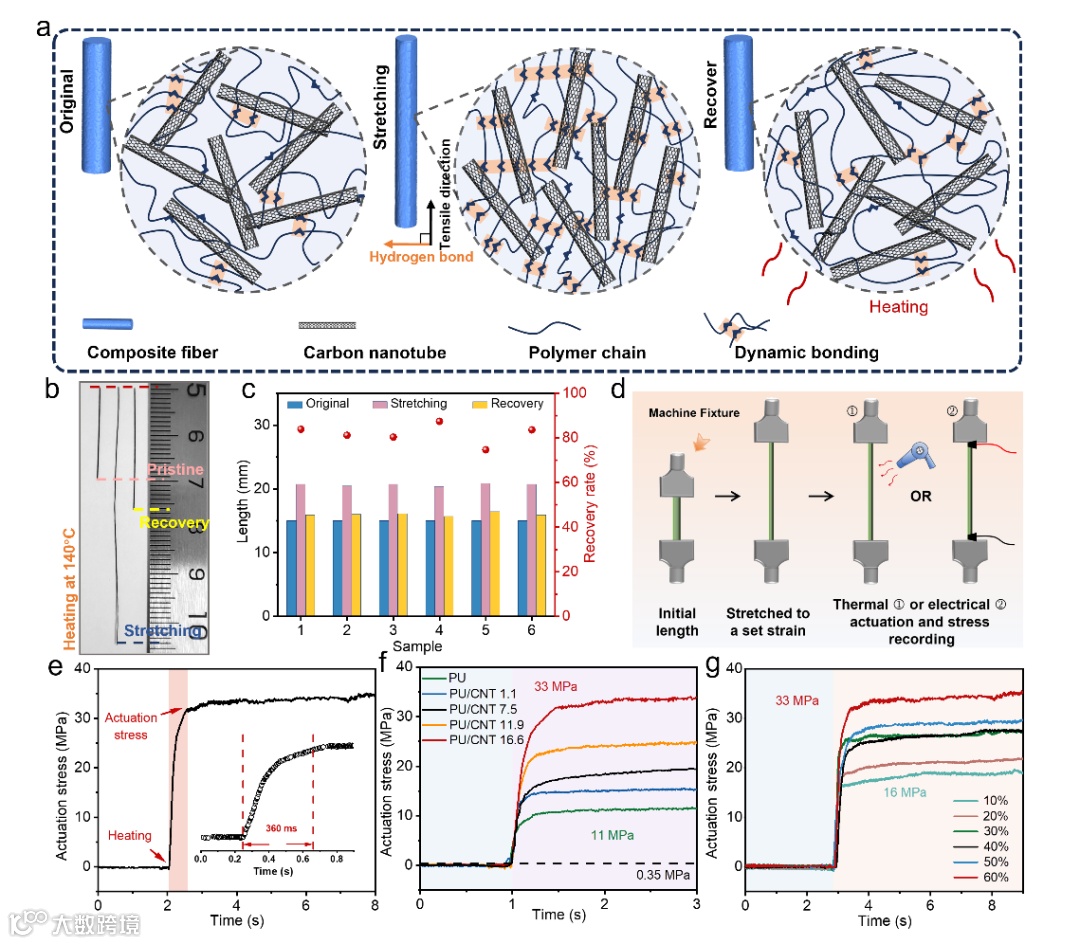 原始 PU/CNT 纤维中的各向异性 CNT 呈随机排列。当拉伸到一定应变时,CNT 和聚合物链会随应变移动,聚合物链段之间的部分氢键会形成并固定,从而导致暂时的拉伸固定状态。当施加热刺激使分子链之间的氢键解离时,纤维内部的应力被释放,内部 CNT 和聚合物链恢复到原来的无序状态。碳纳米管的导电网络使它可以在热/电两种致动模式下工作,热致动提供了高的驱动应力(33 MPa),快速的响应(360 ms),以及高达56.3%的致动应变。通过利用渗透的碳纳米管网络传递到周围的PU基体的焦耳热,复合纤维可以进行电致动,且达到了22 MPa的致动应力。