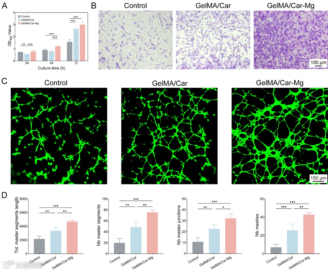 图3. GelMA/Car-Mg水凝胶浸提液对细胞增殖、迁移和体外成血管的影响。