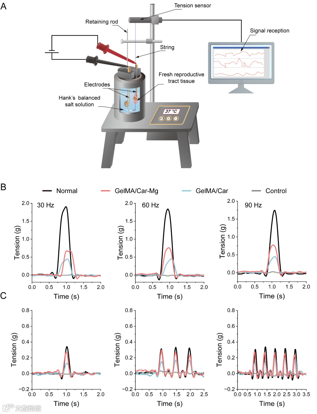 图6. GelMA/Car-Mg水凝胶支架介导的再生生殖道组织的电生理功能测试。