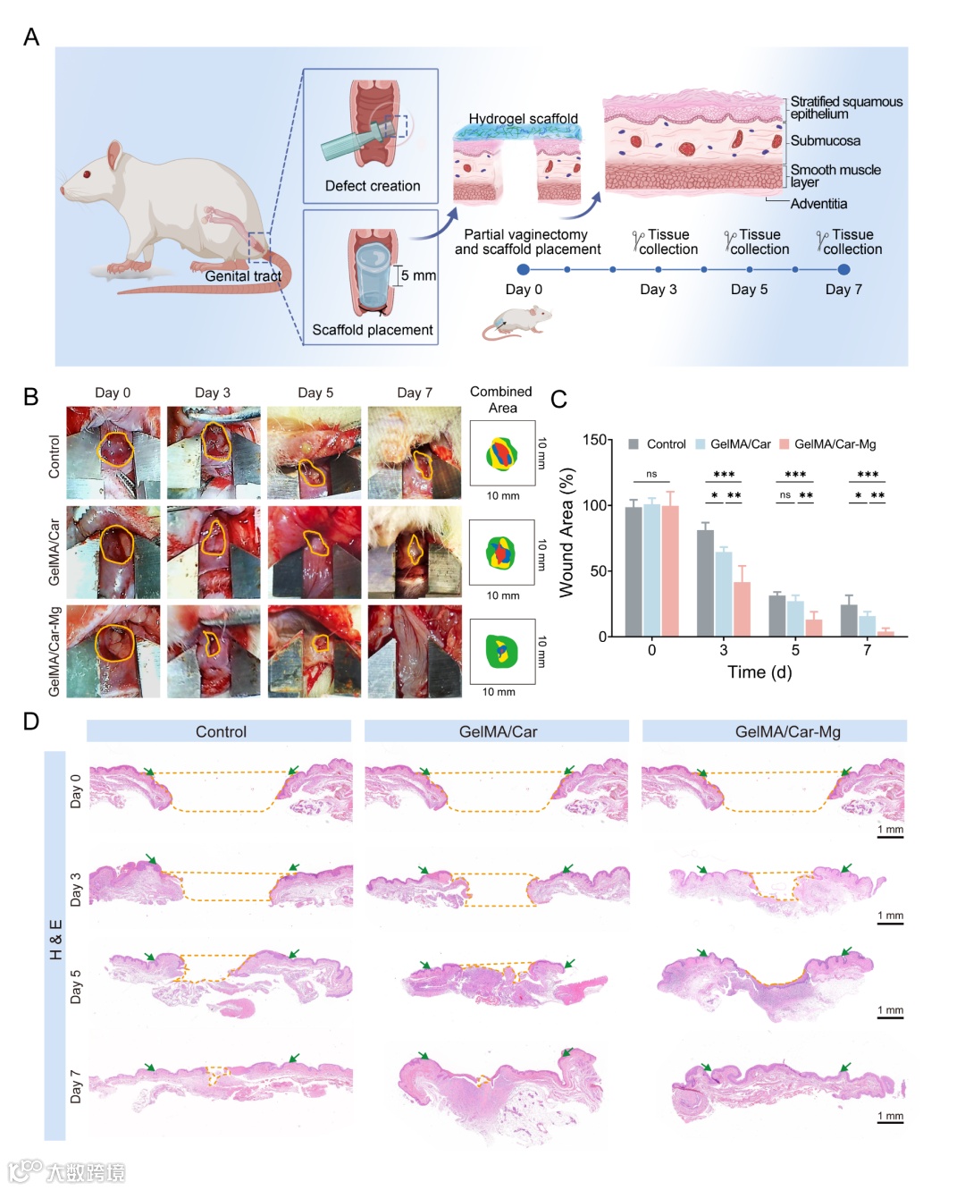 研究人员根据大鼠的生殖道尺寸通过3D打印技术和双交联策略成功制备了定制化的具有良好力学支撑力的GelMA/Car-Mg水凝胶支架,并将其用于在大鼠体内构建的模拟MRKH病情的动物模型中(图4A)。