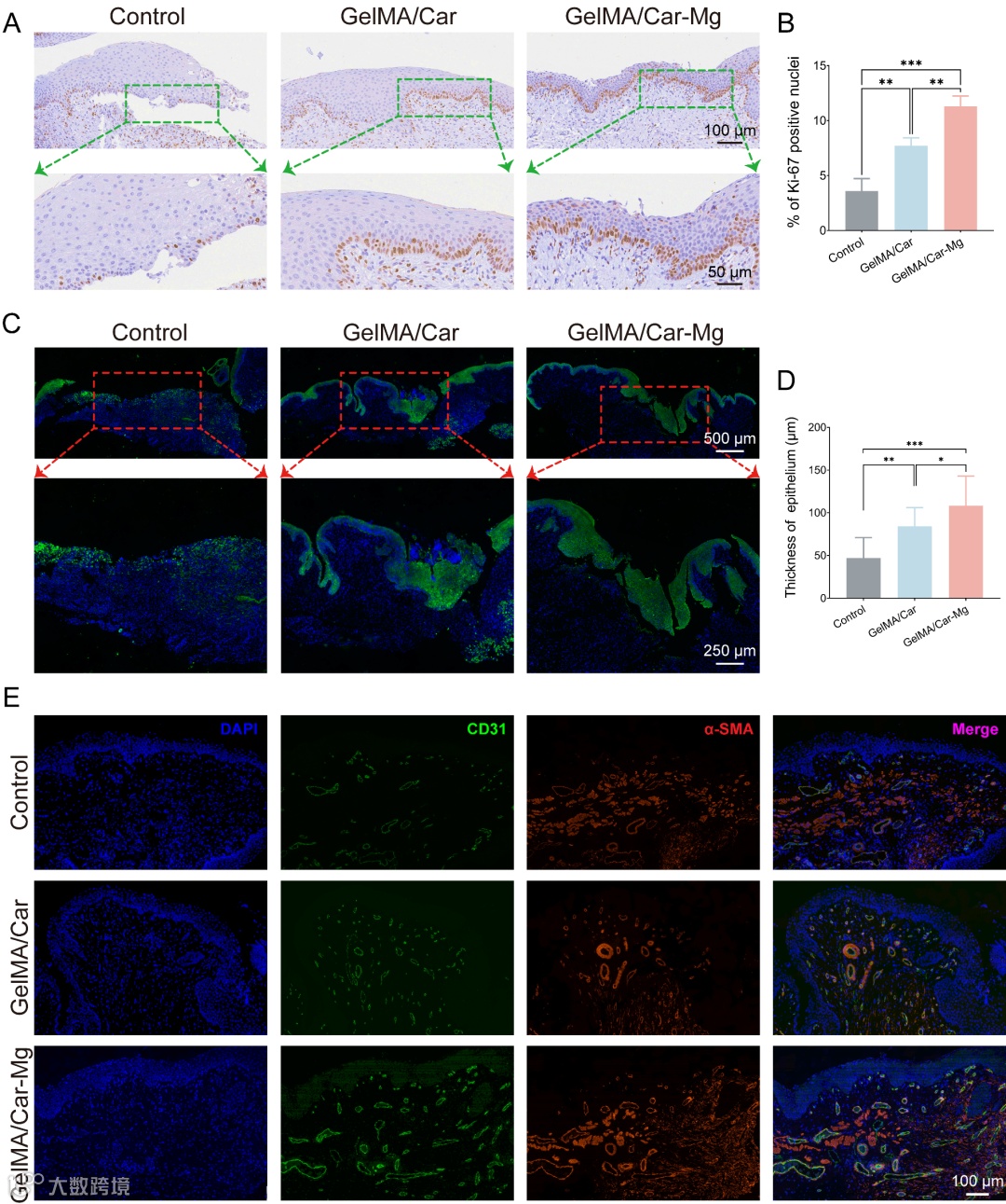 图5. GelMA/Car-Mg水凝胶支架在体内对细胞增殖、上皮化和血管生成的影响。