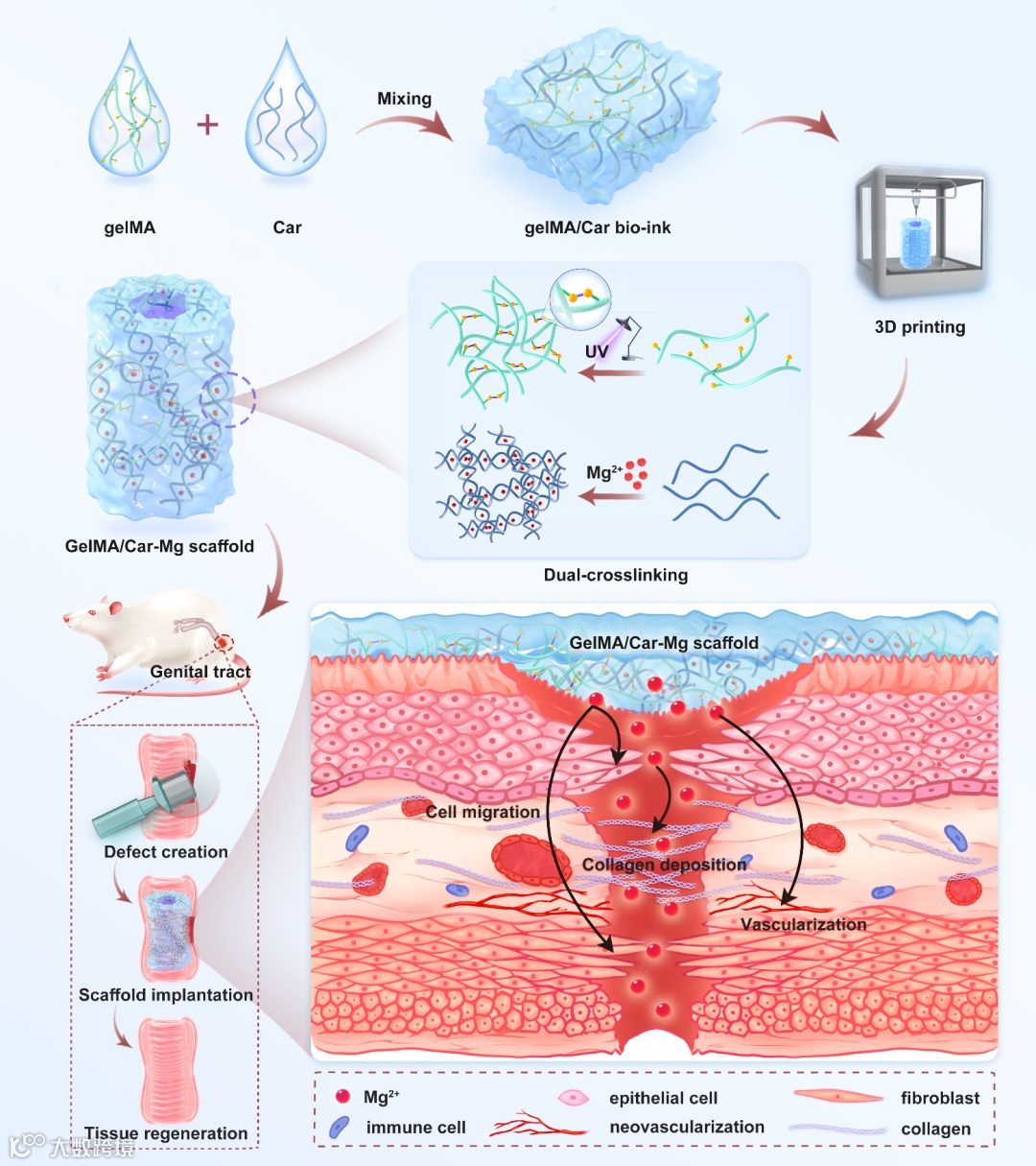 图1.双交联的生物活性GelMA/Car-Mg水凝胶支架的制备及其在生殖道缺损修复中的应用。