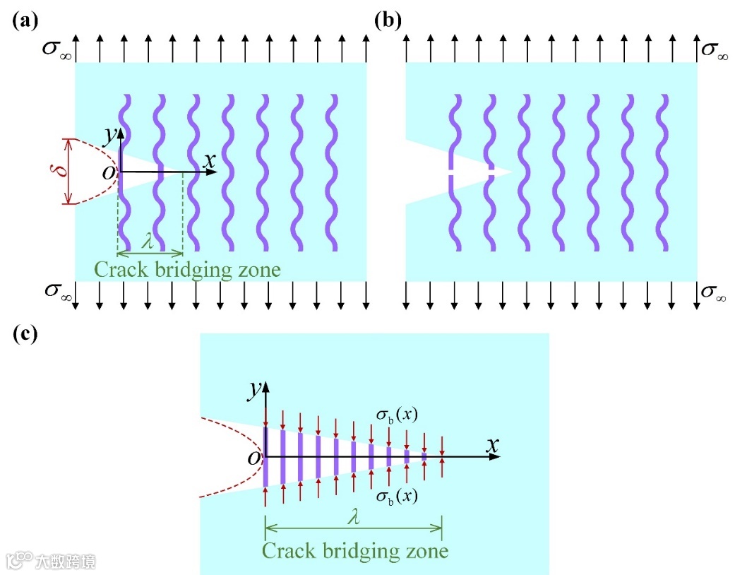 图 1 针对含螺旋纤维的复合结构所提出的裂纹桥联模型。