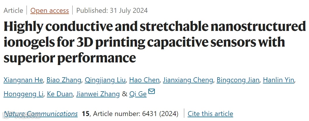近年来,柔性离电器件发展迅速,在软体机器人、人机交互、健康检测、智能可穿戴设备等领域得到广泛应用。离子凝胶具有良好的导电性、拉伸性、热稳定性以及电化学稳定性等优异性能,是构建柔性离电器件的理想材料。数字光处理(digital light processing,DLP)的3D打印技术成型精度高,打印速率快,在柔性传感器制造方面具有巨大的应用前景。但是目前开发的光固化离子凝胶的电学和力学性能之间相互矛盾,开发兼具高导电性和优异力学性能的光固化3D打印离子凝胶存在挑战。