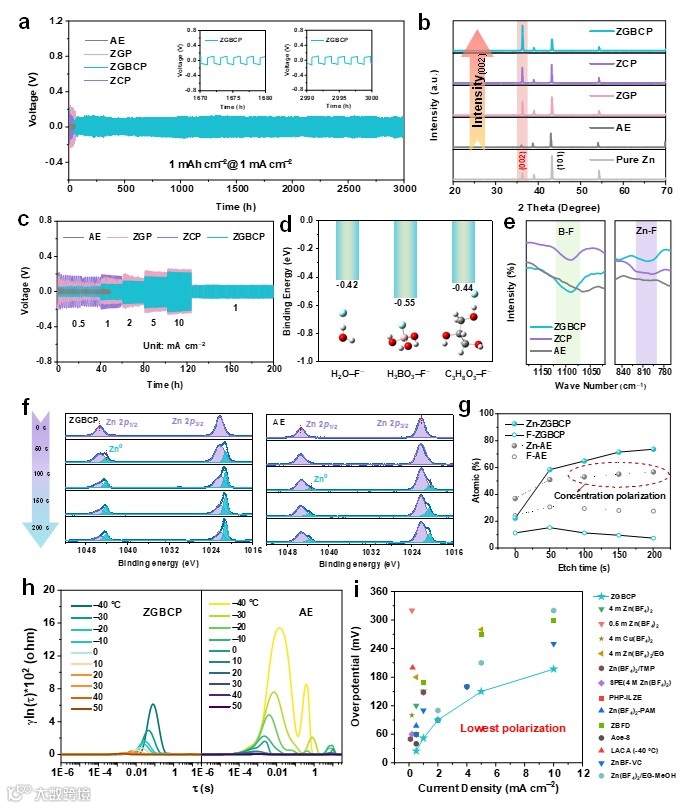 由于阳离子溶剂化结构的去溶剂化能垒显著降低,同时整体具有HER惰性,而来自BF4-阴离子的水解反应被有效抑制,从而在锌负极侧形成了更低浓差极化的良性ZnF2基SEI,这使得Zn||Zn对称电池具有超过3000 h的循环寿命以、较低的极化电压以及宽温域下更低的电荷转移动力学。