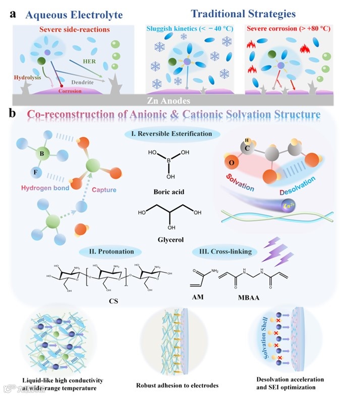 近日,来自中国科学院上海硅酸盐研究所的刘宇研究员、迟晓伟研究员,在国际知名期刊Nature Communications上发表题为“Reconstruction of zinc-metal battery solvation structures operating from-50~+100°C”的研究论文。该论文分析了现在传统水系电解质在宽温域服役过程中电极/电解质之间界面的不稳定性,认为阴离子溶剂化问题对界面问题的影响至关重要,但并未被广泛研究。在此,基于‘硼-醇化学’,通过实现阴离子和阳离子溶剂化结构的协同重构,巧妙地设计了一种宏观上具有优异界面粘附性,而微观上反应动力学和界面稳定性得到有效提升的水凝胶电解质,从而结合了“类液态”的高电导率、“类凝胶”坚固界面和“类固态”的高离子迁移数的多重优势。文章第一作者为中国科学院上海硅酸盐研究所博士生姚凌波,文章通讯作者为中国科学院上海硅酸盐研究所刘宇研究员、迟晓伟研究员。