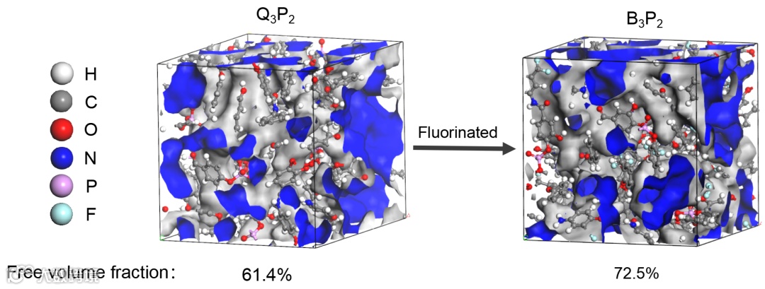 研究人员通过DMA测试了BQP的动态热力学性能,其在室温下的初始储能模量最高达到2400 MPa,通过聚合物的交联网络密度计算,得到了单位体积内的摩尔数量为6578 mol/m3,证明了体系极高的交联程度。并且发现随着三氟甲基的含量增加,交联程度逐渐下降,也导致了体系的刚性下降和力学性能降低,通过分子模拟计算了侧基对空间自由体积的影响。进一步的,聚合物网络在高温下具有明显松弛行为,研究人员通过四种温度下的的松弛结果对两种氟化或非氟化体系进行了归一化计算,得到了不同体系的反应活化能,发现三氟甲基的引入能够降低反应活化能,这能够帮助其更好地实现动态键交换。