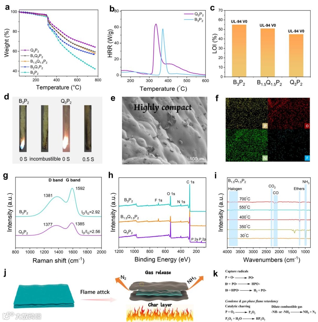 图3. (a) N2条件下BQP的热解行为。(b)微型量热计算中Q3P2和B3P2的放热速率。(c) BQP的垂直燃烧和氧指数测试结果柱状图。(d) UL-94测试中Q3P2和B3P2的燃烧照片。(e) B3P2碳层的SEM照片。(f)能谱仪测得的P, O, N, f元素分析。(g) B3P2和Q3P2炭层的拉曼光谱。(h) BQPs的炭层XPS分析。(i) TG-IR测定不同热解温度下B1.5Q1.5P2的气体释放。(j)阻燃机理的简单示意图。(k)燃烧过程中的部分自由基反应。