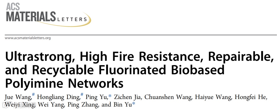 以上成果近日以“Ultrastrong, High Fire Resistance, Repairable, and Recyclable Fluorinated Biobased Polyimine Networks”为题在线发表在国际著名学术期刊《ACS Materials Letters》上。通讯作者为中国科学技术大学余彬教授,江苏海洋大学青年教师宇平博士为文章共同通讯作者,王爵硕士和丁洪亮博士为共同一作,江苏海洋大学王海跃、贾子辰等共同参与。团队一直致力于发展高性能、防火阻燃的动态聚合物材料,并取得了系统的理论和研究成果。第一完成单位是中国科学技术大学,第二完成单位是江苏海洋大学。在此,也期待更多的基础性策略和有趣的应用场景在动态高分子材料等前沿聚合物材料上得到突破。