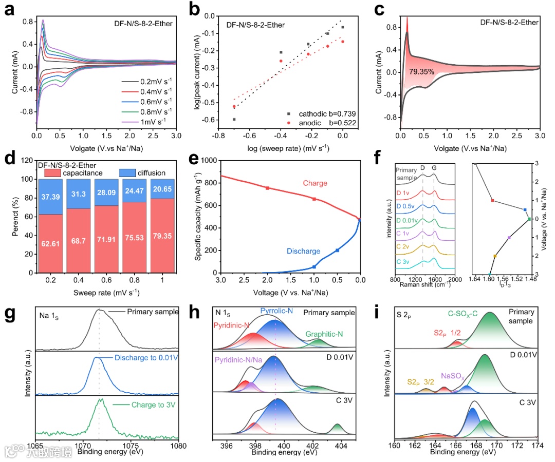 为了深入了解化学状态并准确量化原子比,他们采用了X射线光电子能谱(XPS)技术来确定样品的化学成分和元素状态。DF-N/S-8-2-800°C样品的XPS光谱清晰地显示出碳、氧、氮和硫的信号,与EDS分析结果一致。为了更详细地分析掺杂杂原子的化学状态,图3d-g展示了C 1s、N 1s和S 2p的高分辨率XPS光谱。C 1s XPS谱图显示了对应于C-N和C-S键的特征峰,表明杂原子的掺杂导致电子电荷在碳基体上的重新分配,从而产生了有效的活性位点。这些活性位点增强了与反应物分子的相互作用,从而促进了更有效化学过程。图3e显示了DF-N/S-8-2-800°C样品的O 1s光谱。通过反卷积处理,可以将该光谱分解为三个不同的峰:占信号46.54%的OI(532.2 eV处的C=O)、占25.13%光谱强度的OII(533.2 eV处的C-OH和C-O-C),以及占28.33%的OIII(534.1 eV处的COOR基团)。需要指出的是,单宁酸是一种含氧量较高的碳源。然而,尽管氧基团在碳表面很普遍,但迄今为止发表的大多数研究都忽略了氧在碳负极中的重要性。在含氧官能团中,C=O和COOR基团能够有效地吸附Na+。此外,含有C-O的官能团有助于产生大量缺陷,导致碳层之间的间距扩大,从而增强电极的润湿性。含氧基团通过促进离子吸附和改善电极-电解质相互作用,在优化钠离子电池性能方面发挥着关键作用。所有观察到的氮峰都可以反卷积成三个不同的区域,分别对应于398.2 eV的吡啶氮、401.1 eV的吡咯氮和408.1 eV的石墨氮。这种吡啶氮结构有利于引入大量的缺陷和活性位点,从而增强电荷转移、促进表面诱导的赝电容效应,并显著提高材料的电化学活性。S 2p XPS光谱揭示了材料中硫掺杂的化学状态。在163.6 eV和164.8 eV处观察到的两个峰分别对应于S 2p3/2和S 2p1/2,表明存在C-S-C键。此外,169.1 eV处的峰值可归因于C−SOx−C键。硫的掺杂为钠离子提供了额外的吸附位点,有助于提高材料的比容量并增强循环稳定性。