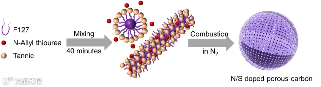 单宁酸是一类从木材、水果和树皮等多种植物中天然提取的多酚类化合物,以其价格低廉、无毒和广泛可获得而闻名。F127是一种ABA型非离子表面活性剂,其中EO代表环氧乙烷,PO代表环氧丙烷。首先, F127在一定浓度下, PPO与PEO之间形成球形胶束。其次,这些单一胶束与单宁酸前体及N-烯丙基硫脲的羟基相互组装形成胶束低聚物复合物。随着溶剂逐渐蒸发,胶束上的低聚物交联促进了这些胶束低聚物复合物的有序组装,形成球形结构。在随后的碳化过程中,F127在高温下逐渐分解,同时留下不会破坏材料整体结构的孔隙。与此同时,N-烯丙基硫脲碳化后的杂原子仍保留在碳球骨架中。