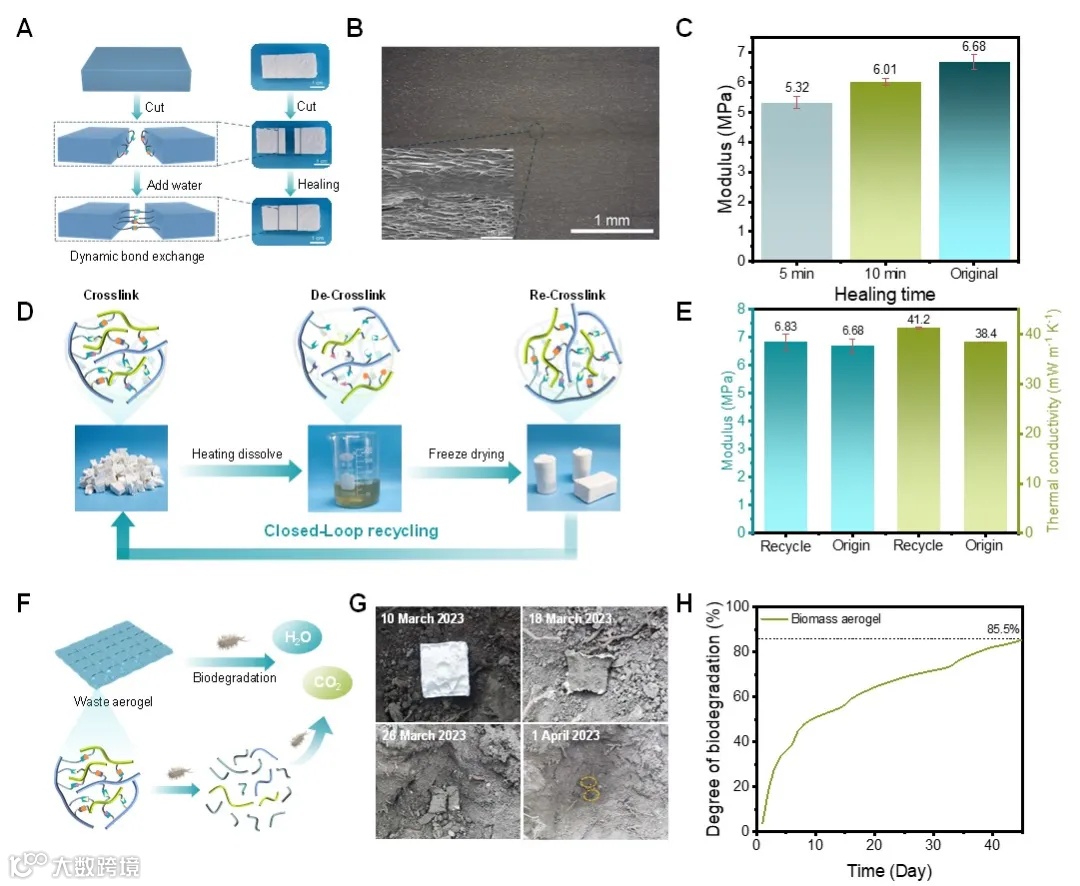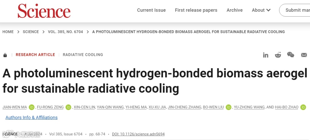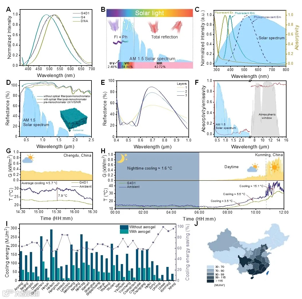 近日,四川大学环保型高分子材料国家地方联合工程实验室赵海波教授团队提出了一种基于生物质本征光致发光辐射制冷新策略,发展了具有高太阳光反射率、可大规模制备、可循环利用的全生物质辐射冷却气凝胶。研究发现,由明胶和DNA制备的生物质气凝胶具有独特的荧光/磷光特性以及高度有序的层状结构。这种本征光致发光效应使得气凝胶将吸收的紫外光转化为可见光,有效提高气凝胶材料在可见光区域的太阳光加权反射率(太阳光模拟下高达104.0%),大幅增益气凝胶材料的日间辐射冷却效率。该气凝胶在高太阳辐照度的户外条件下,环境温度降低达16.0 ℃,表现出优异的制冷性能。另一方面,利用水介导气凝胶界面处强离子氢键的可逆解离-重构特性,通过可扩展、普适的水焊接策略实现了具有各向异性孔结构气凝胶板的大规模制备,长程有序的孔结构可确保气凝胶材料光学性质及综合性能的可靠性。此外,该全生物质气凝胶材料具有阻燃、可快速自修复、可循环利用和可生物降解等性能,在材料来源、制备、使用及废弃的全生命周期具有高环境友好性。这种可扩展的光致发光生物质冷却气凝胶有望显著减少碳排放和能源消耗,为未来可持续辐射冷却材料的设计制备提供新思路。