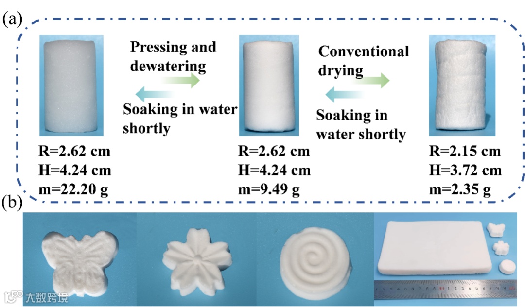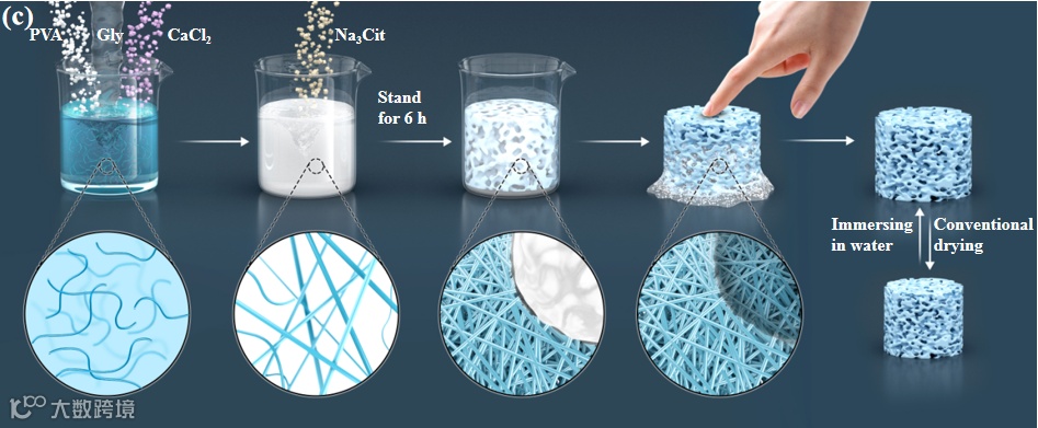 图1 (a) 海绵状水凝胶、湿海绵和干海绵的转化;(b) 不同形状的聚乙烯醇海绵和大尺寸样品图;(c) 聚乙烯醇海绵的合成工艺。